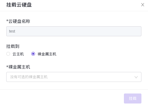 挂载云硬盘有两种途径,一种是在云硬盘页面操作,另一种是在裸金属主机页面操作。本节仅介绍前者,后者的详细介绍请参考裸金属主机的帮助内容。非共享盘处于“可用”状态的云硬盘才能进行本操作,一个云硬盘在同一时间只能挂载到一个裸金属主机上,挂载完成后状态变为“使用中”。共享盘处于“可用”或“使用中”状态的云硬盘才能进行本操作,一个云硬盘在同一时间能挂载到多个裸金属主机上,挂载完成后状态变为“使用中”。