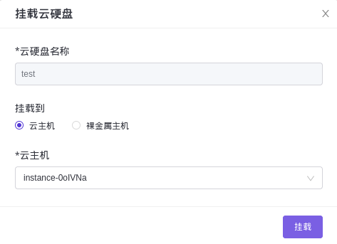 挂载云硬盘有两种途径,一种是在云硬盘页面操作,另一种是在云主机页面操作。本节仅介绍前者,后者的详细介绍请参考云主机的帮助内容。非共享盘处于“可用”状态的云硬盘才能进行本操作,一个云硬盘在同一时间只能挂载到一个云主机上,挂载完成后状态变为“使用中”。共享盘处于“可用”或“使用中”状态的云硬盘才能进行本操作,一个云硬盘在同一时间能挂载到多个云主机上,挂载完成后状态变为“使用中”。