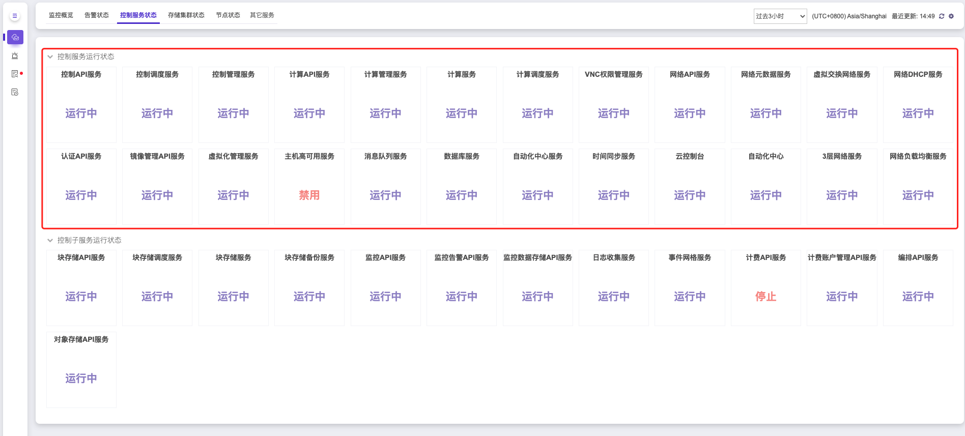 控制服务运行状态展示的是集群中的核心服务运行状态,如计算服务、计算调度服务、网络核心服务、2层网络服务等。当该区域内的服务状态停止或无数据时,会影响集群业务的正常运行,导致服务中断。例如:当某个节点计算服务状态为停止或无数据时,平台将无法在该节点继续创建云主机。