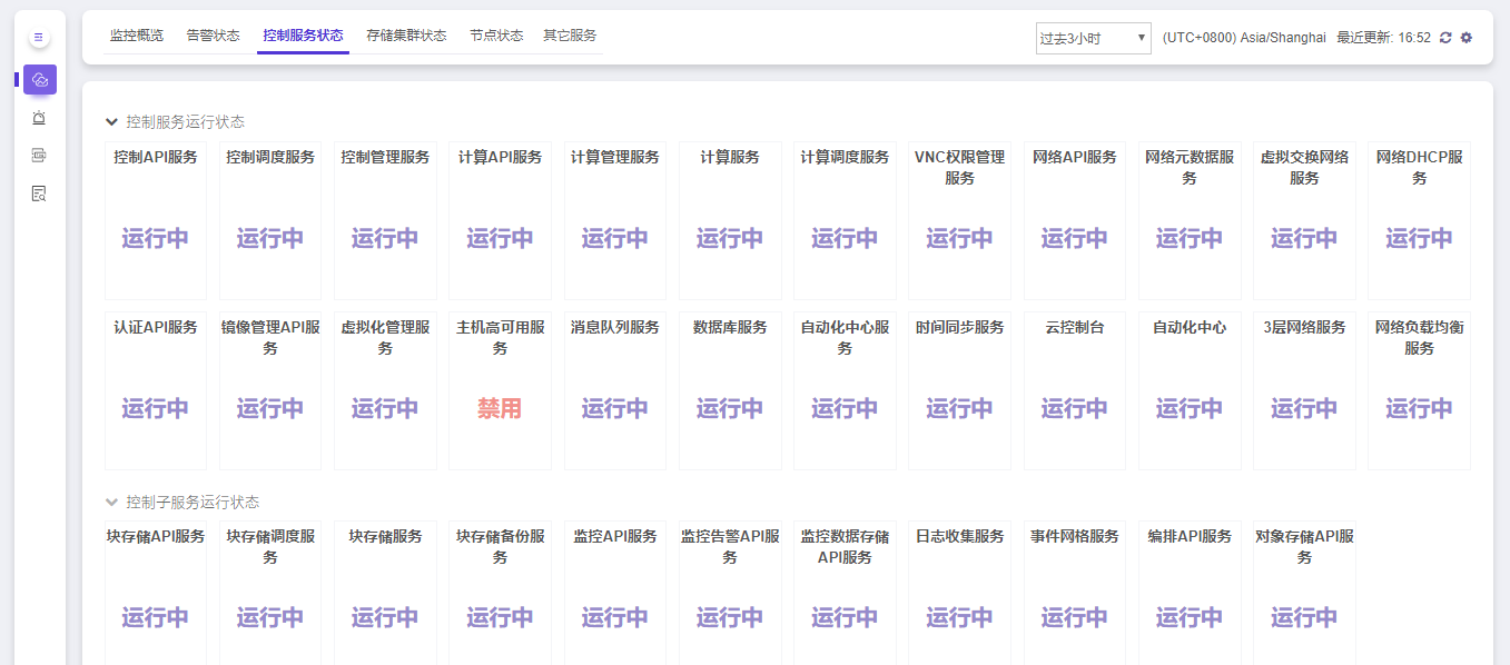 控制服务运行状态展示的是集群中的核心服务运行状态,如计算服务、计算调度服务、网络核心服务、2层网络服务等。当该区域内的服务状态停止或无数据时,会影响集群业务的正常运行,导致服务中断。例如:当某个节点计算服务状态为停止或无数据时,平台将无法在该节点继续创建云主机。