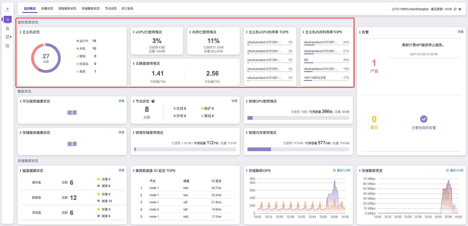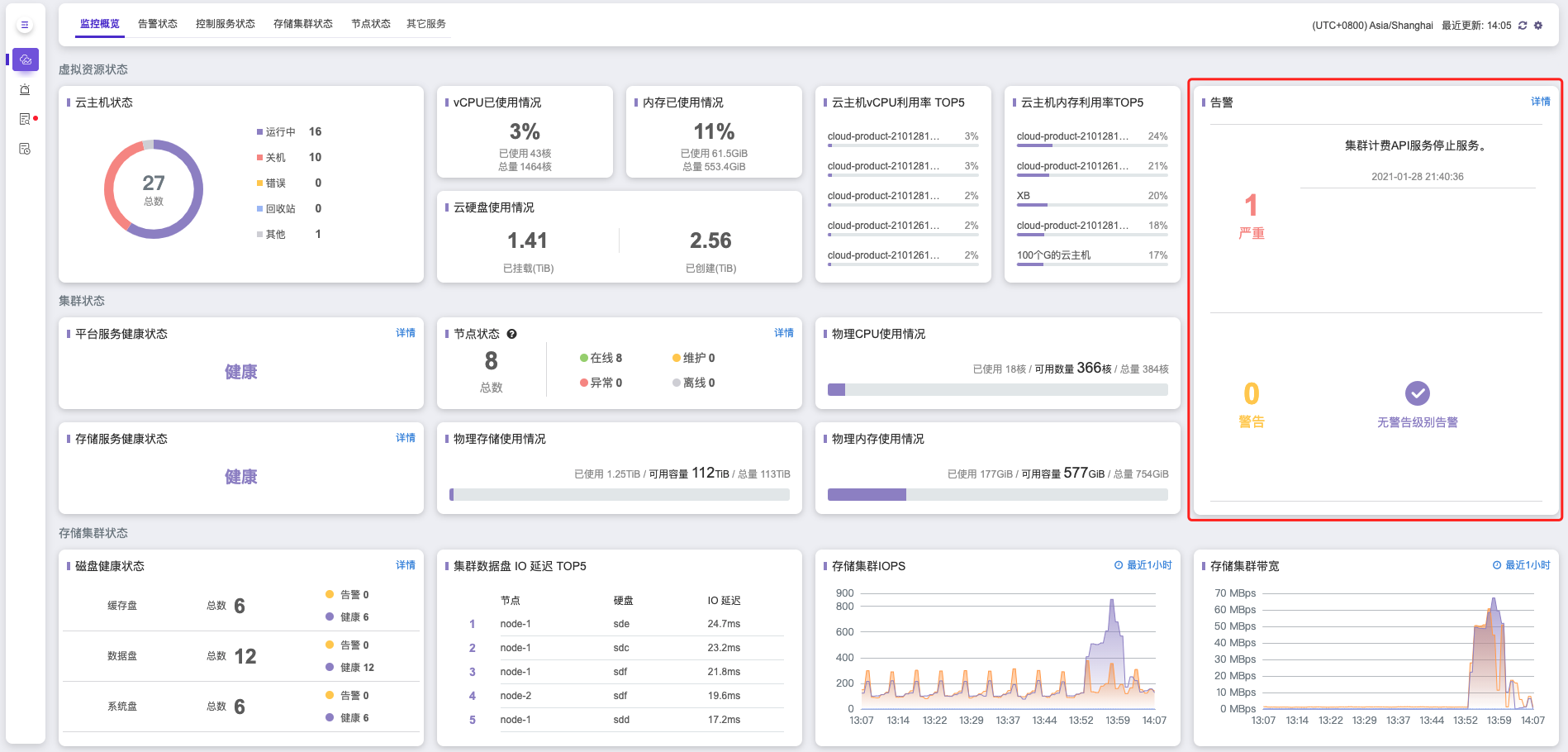 集群状态 展示项中您可以清晰查看 平台服务健康状态 、 存储服务健康状态 、 物理节点 在线/维护/异常/离线等状态、 物理CPU/内存/存储使用情况 等。