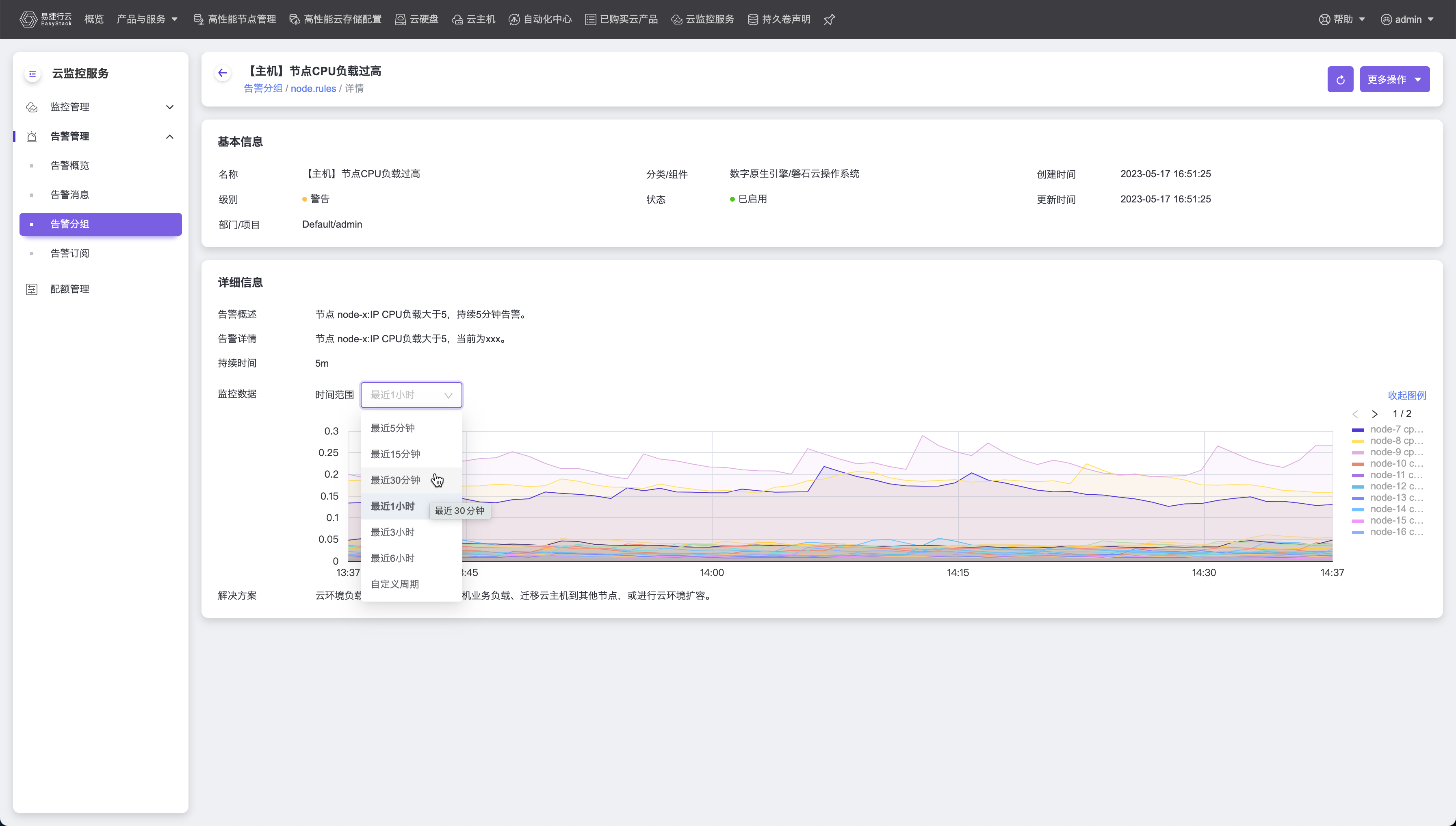该页面除基本信息外,还展示了告警规则的详细内容,如告警概述、告警详情、持续时间、监控数据和解决方案,其中监控数据展示了该告警规则在指定时间内的趋势变化,可以调整时间范围,更细粒度或者更粗粒度的查看趋势,同时可以点击右侧的 展开/收起图例 按钮查看每条线单独的变化。
