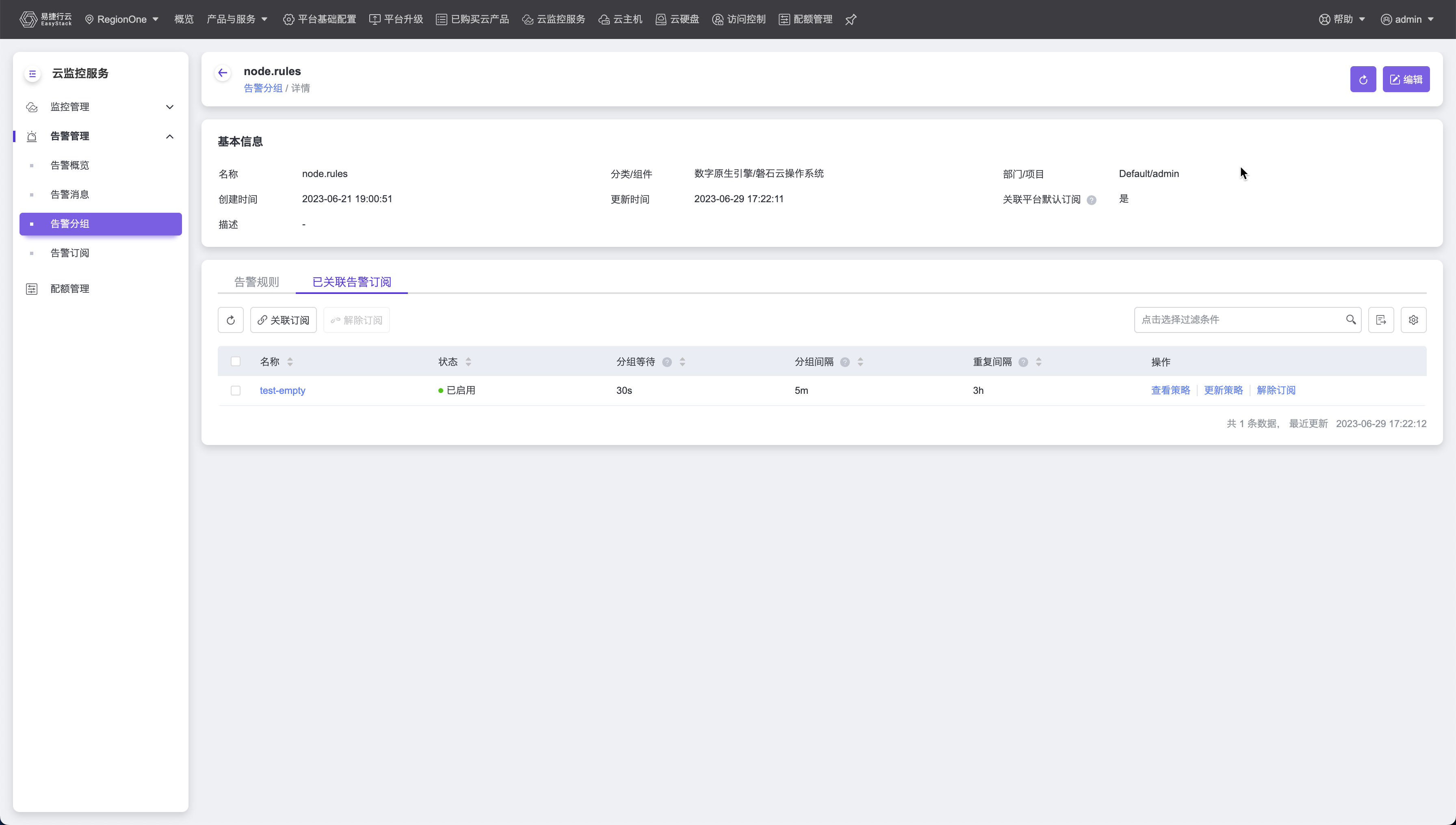 页面上除基本信息以外,还会展示属于该告警分组的告警规则的列表,以及与其关联的告警订阅的信息。