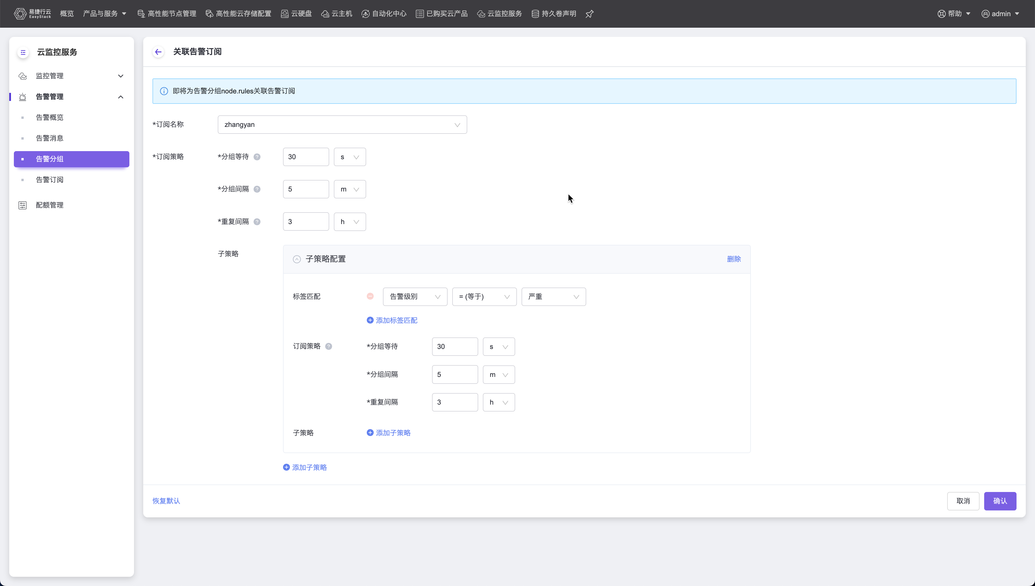 订阅策略:订阅策略需要填写三个配置,分组等待、分组间隔和重复间隔;