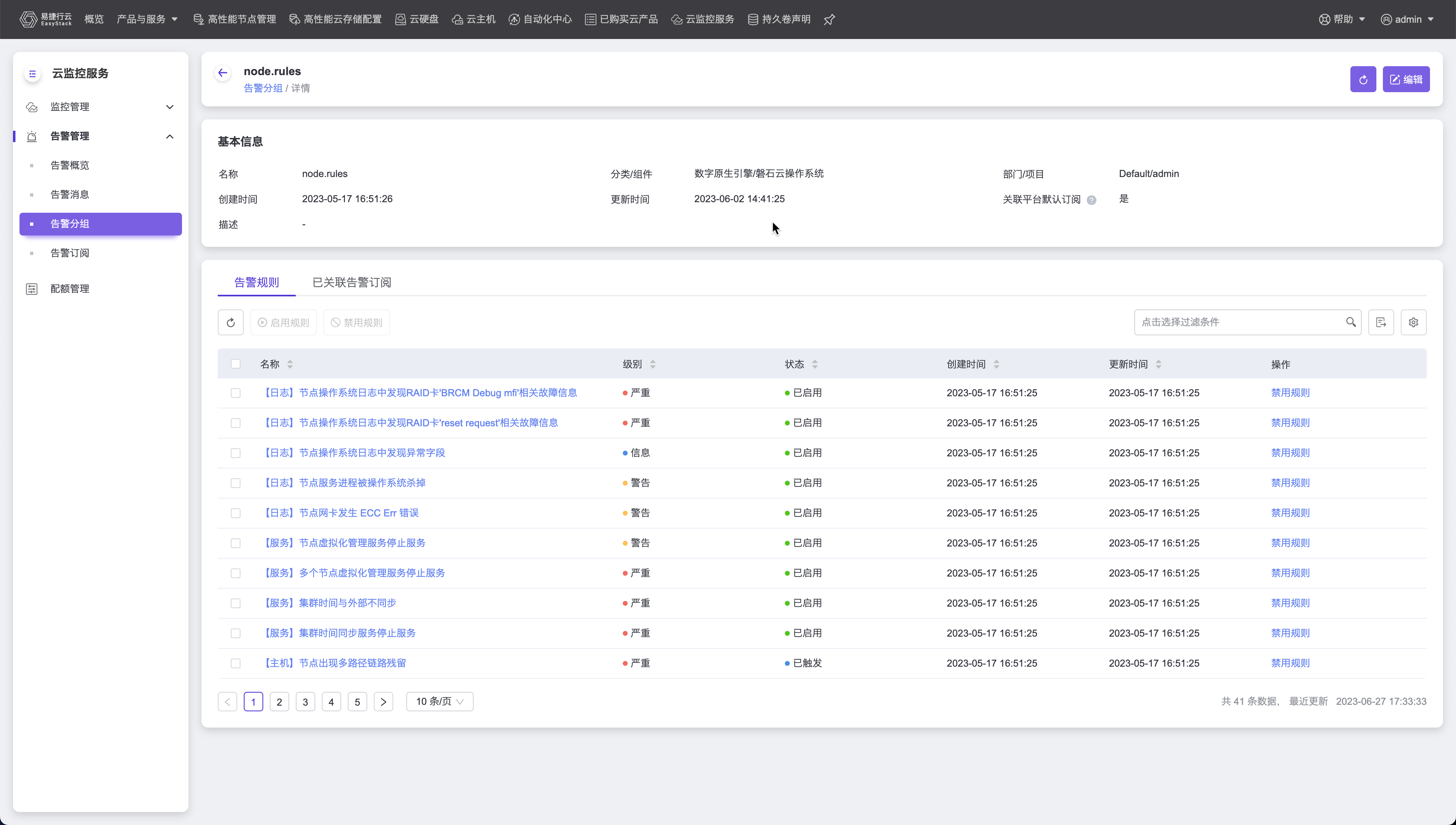 在点击告警分组的名称后,进入告警分组的详情页面,在该页面即可看到该分组下所有的告警规则信息