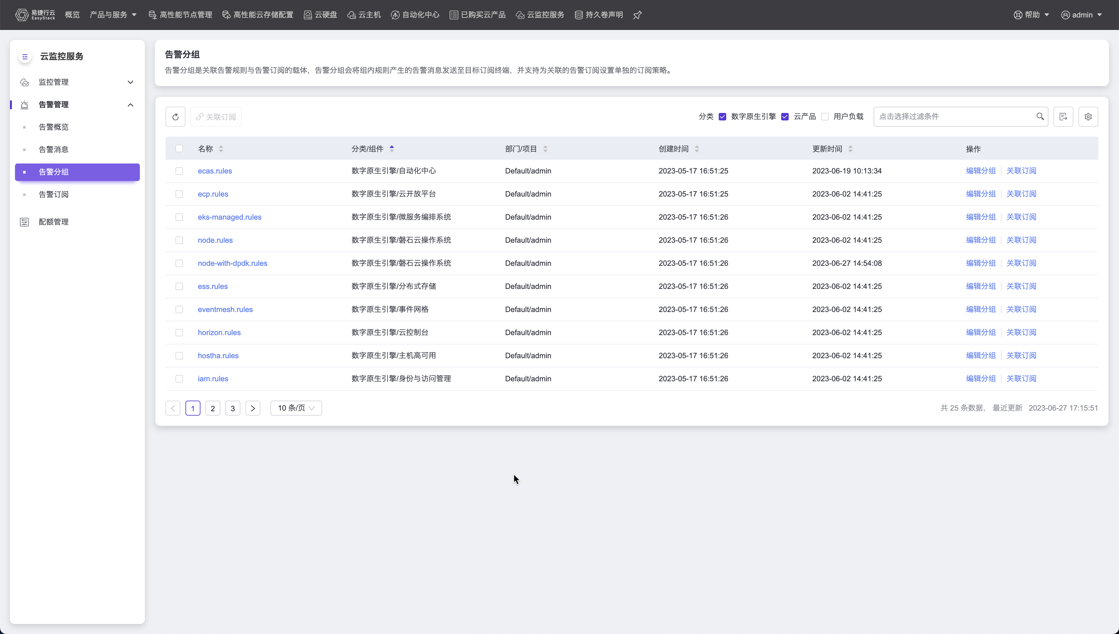 - 当该告警分组属于数字原生引擎或者云产品时,用户可以更改告警分组的描述信息以及是否勾选关联平台默认订阅;