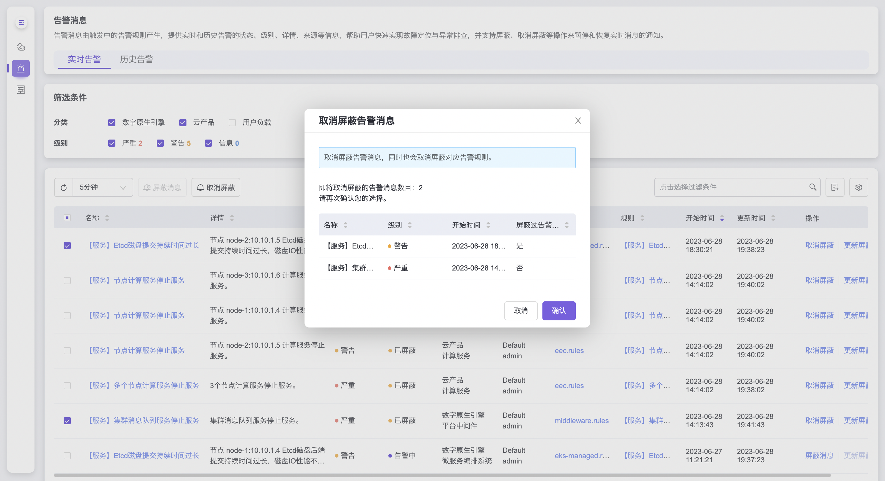 取消屏蔽操作将恢复实时告警消息的通知,操作后的告警消息状态将由已屏蔽变为告警中: