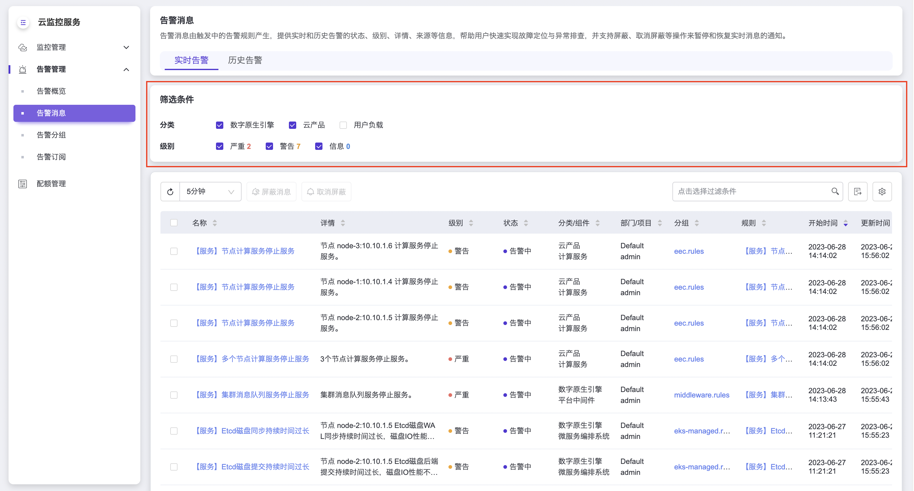 实时告警页签展示的是正在告警的告警消息,筛选条件下方的是实时告警列表,包括告警消息的名称、详情、级别、状态、分类、组件、所属部门和项目(仅云管理员用户可见)、对应分组和规则、开始时间、更新时间和操作。