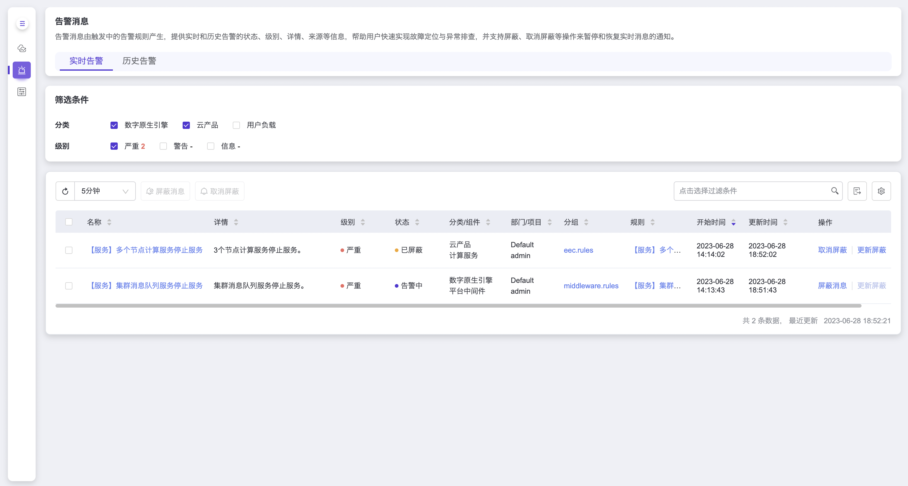 实时告警消息由触发中的告警规则产生,存在 告警中 和 已屏蔽 两种状态: