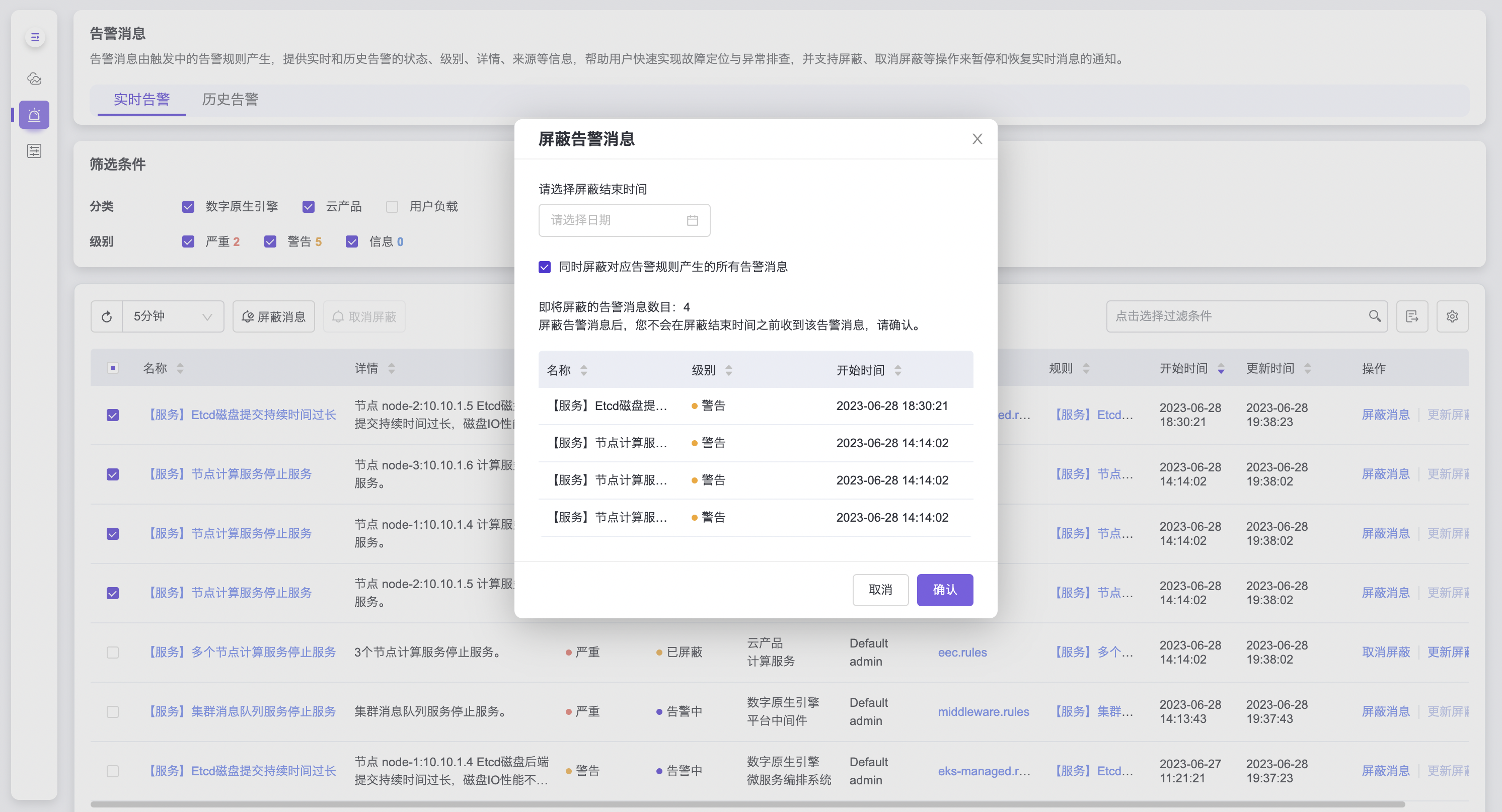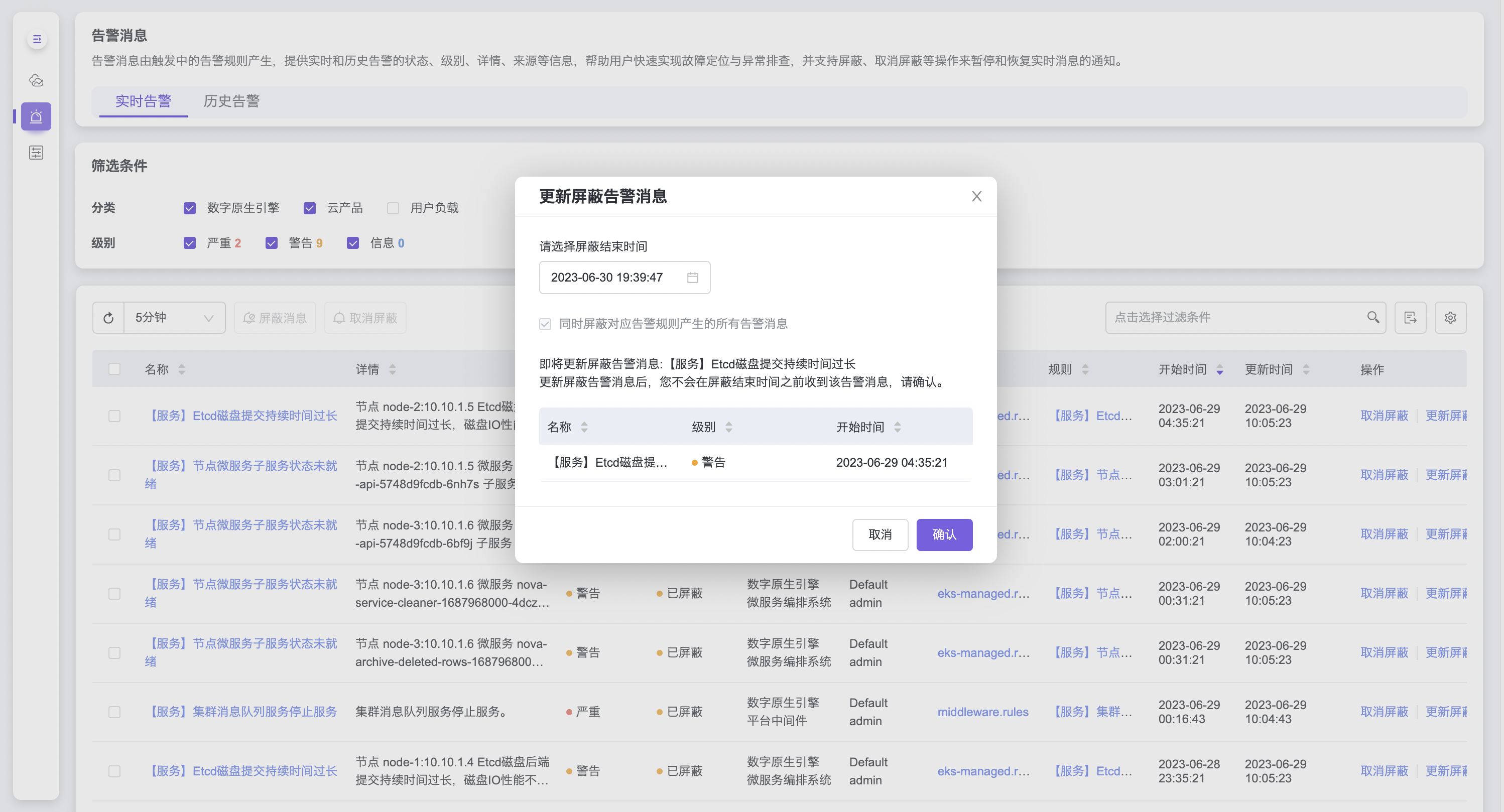 屏蔽消息操作可暂停实时告警消息的通知推送,操作后的告警消息状态将由告警中变为已屏蔽: