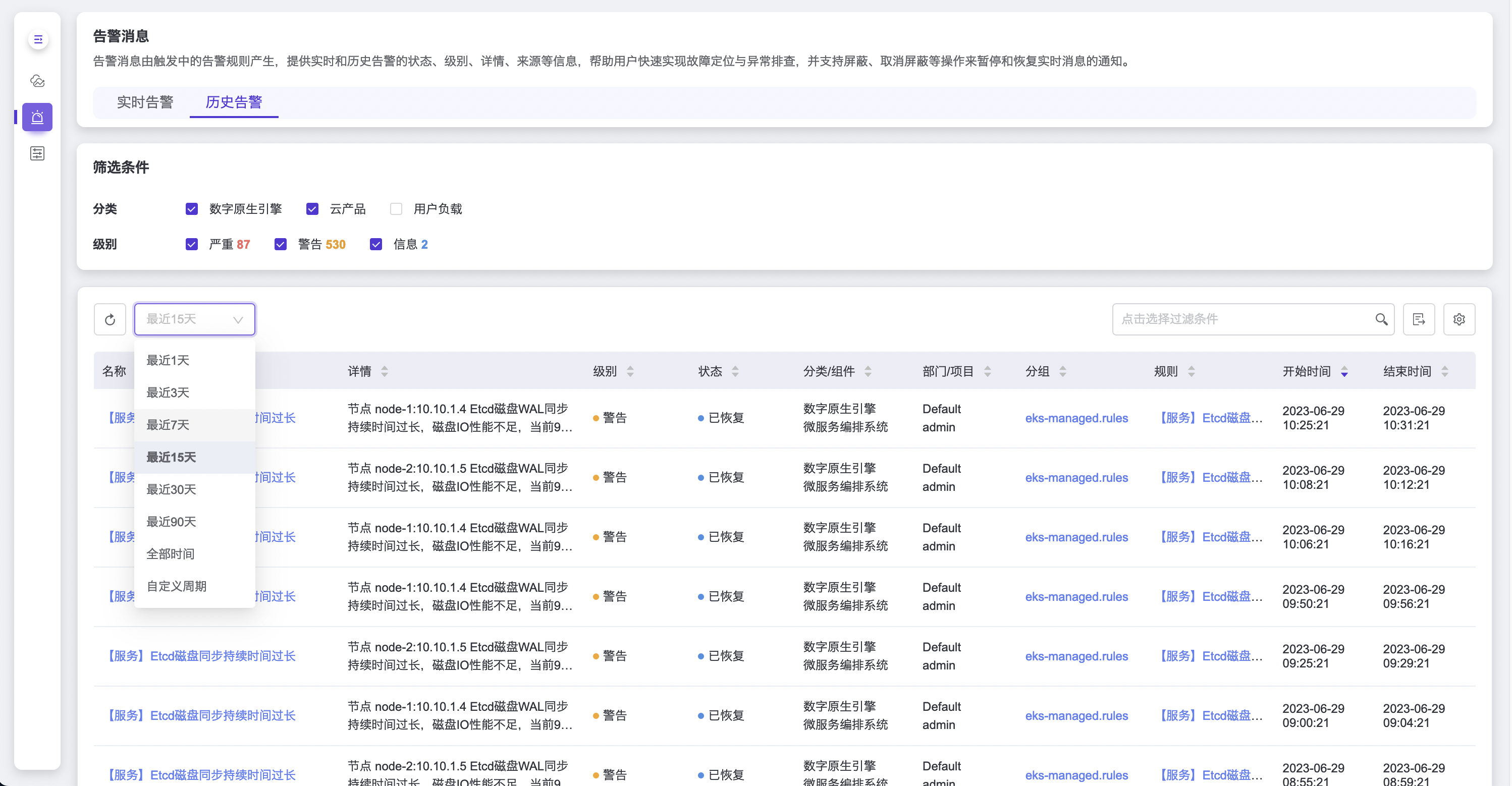 历史告警页签展示的是已恢复的告警消息,筛选条件下方的是历史告警列表,包括告警消息的名称、详情、级别、状态、分类、组件、所属部门和项目(仅云管理员用户可见)、对应分组和规则、开始时间和结束时间。