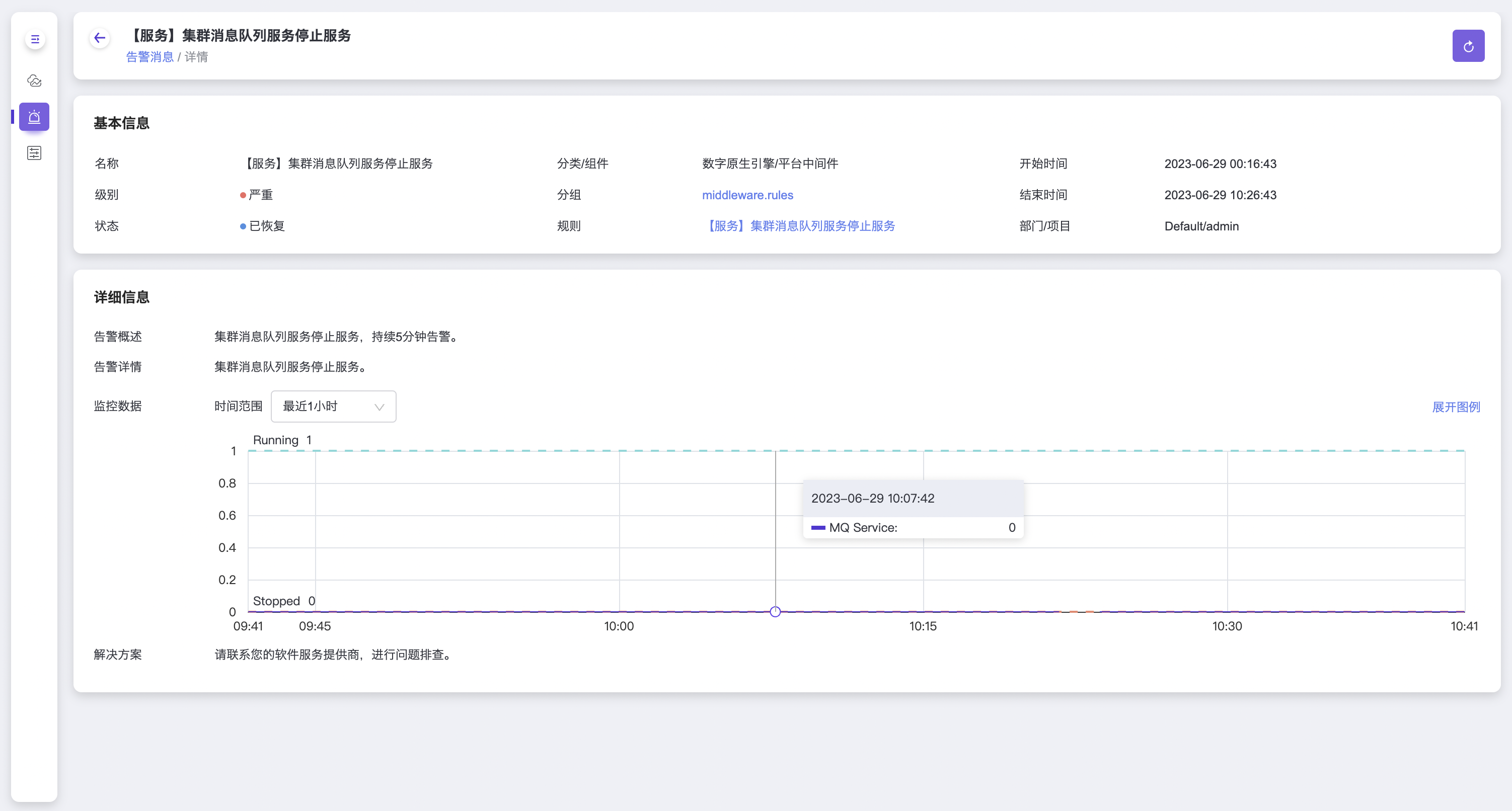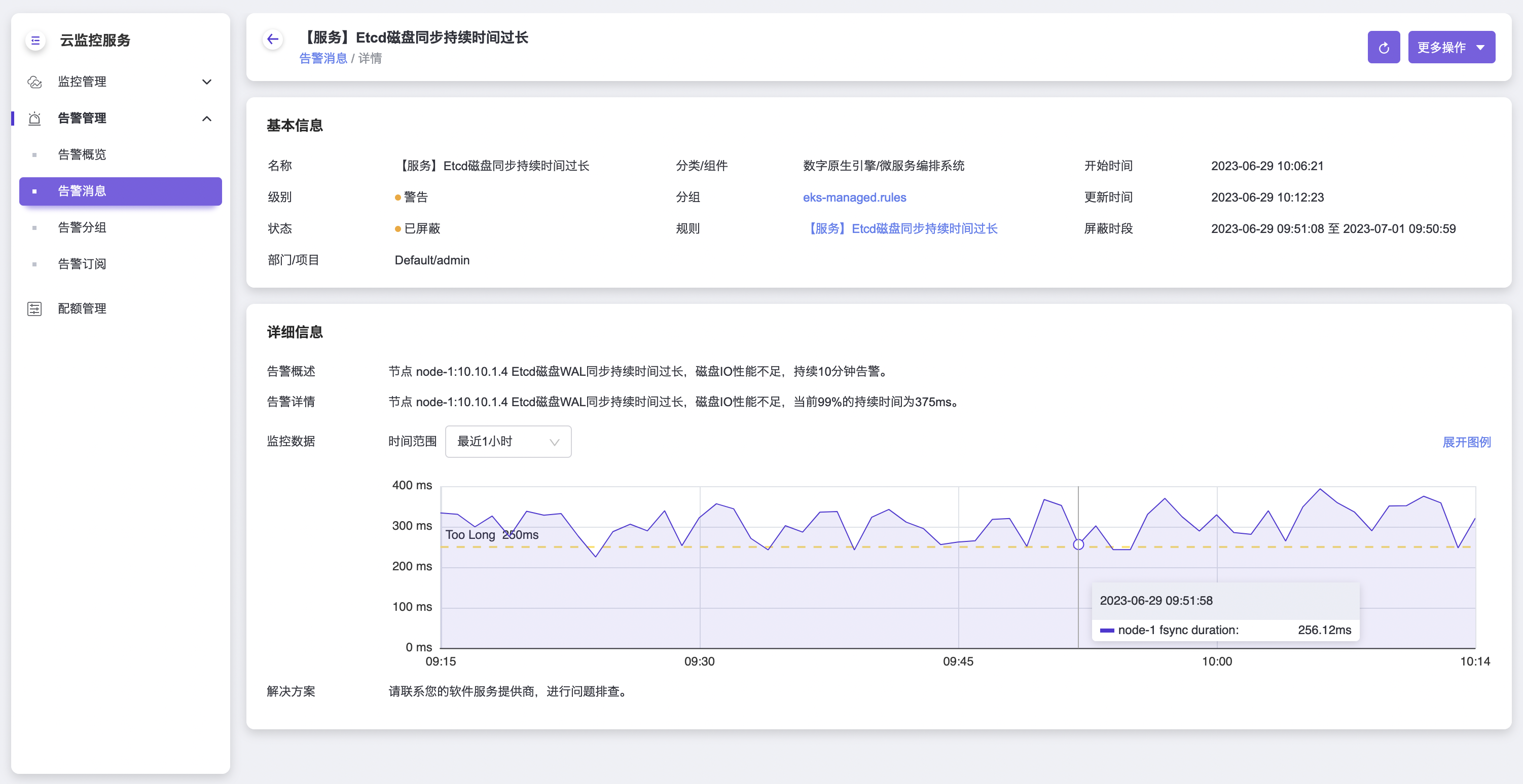 - 详细信息包括告警概述、告警详情、监控数据和解决方案。