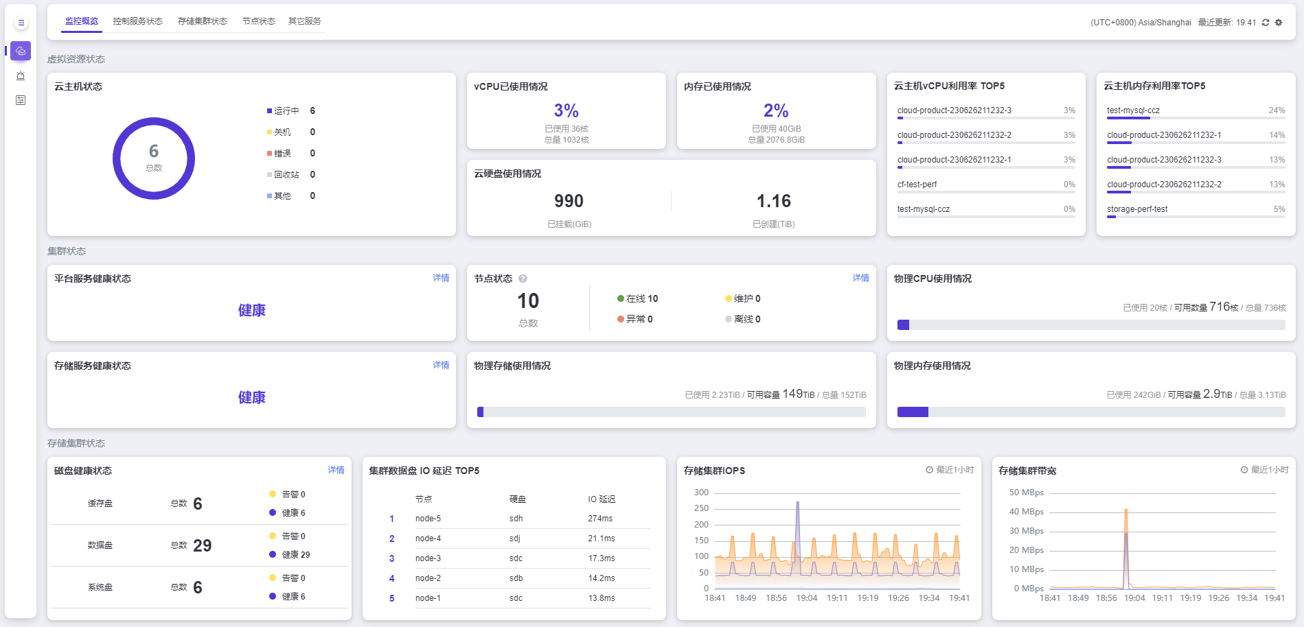 存储集群状态 展示集群中缓存盘、数据盘及系统盘的总数和相应的健康状态,集群数据盘IO 延迟 Top5、存储集群IOPS 以及 存储集群的读写带宽。