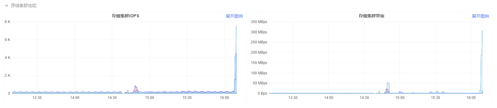 在 存储集群性能 展示项中您可以查看到存储集群整体的IOPS和带宽。鼠标移动到图表上后,可以分别查看到整个存储集群读写的IOPS和带宽。