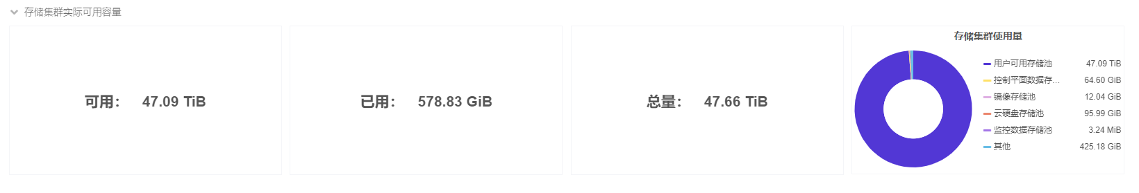 您在 存储集群实际可用容量 展示项中可以查看到集群中用户可使用、已使用以及总存储容量。在右侧的圆饼图中,您也可以查看到集群使用的详细情况,存储集群可用容量主要用于后端的 镜像存储池、控制平面数据存储池、云硬盘备份存储池、云硬盘存储池、监控数据存储池、用户可用存储池 等。
