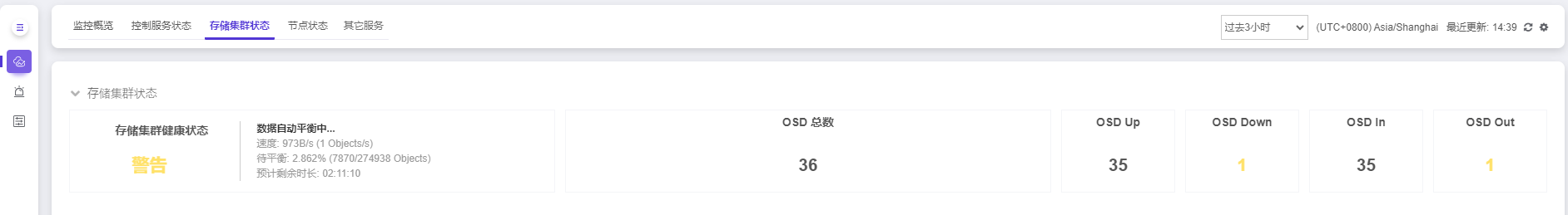 存储集群处于数据再平衡维护状态。您可以在存储集群健康状态查看数据再平衡详细信息包括:恢复速度,待平衡进度和预计剩余时长。需要注意的是这些详细信息在数据再平衡过程中会出现闪烁消失直到完成,但是这是系统在界面显示上正常的可预期行为。