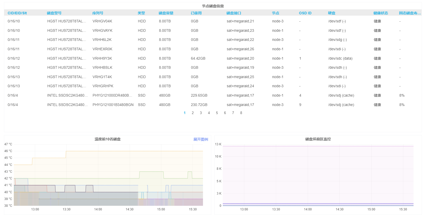 您也可以监控到集群所有节点上所有磁盘的温度以及磁盘损坏情况。