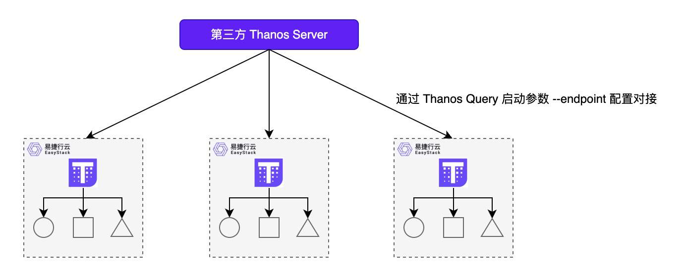 对于 Thanos 而言,支持通过服务发现的方式在第三方 Thanos Query 服务的启动参数中配置云平台 Thanos Query 地址来完成对接。