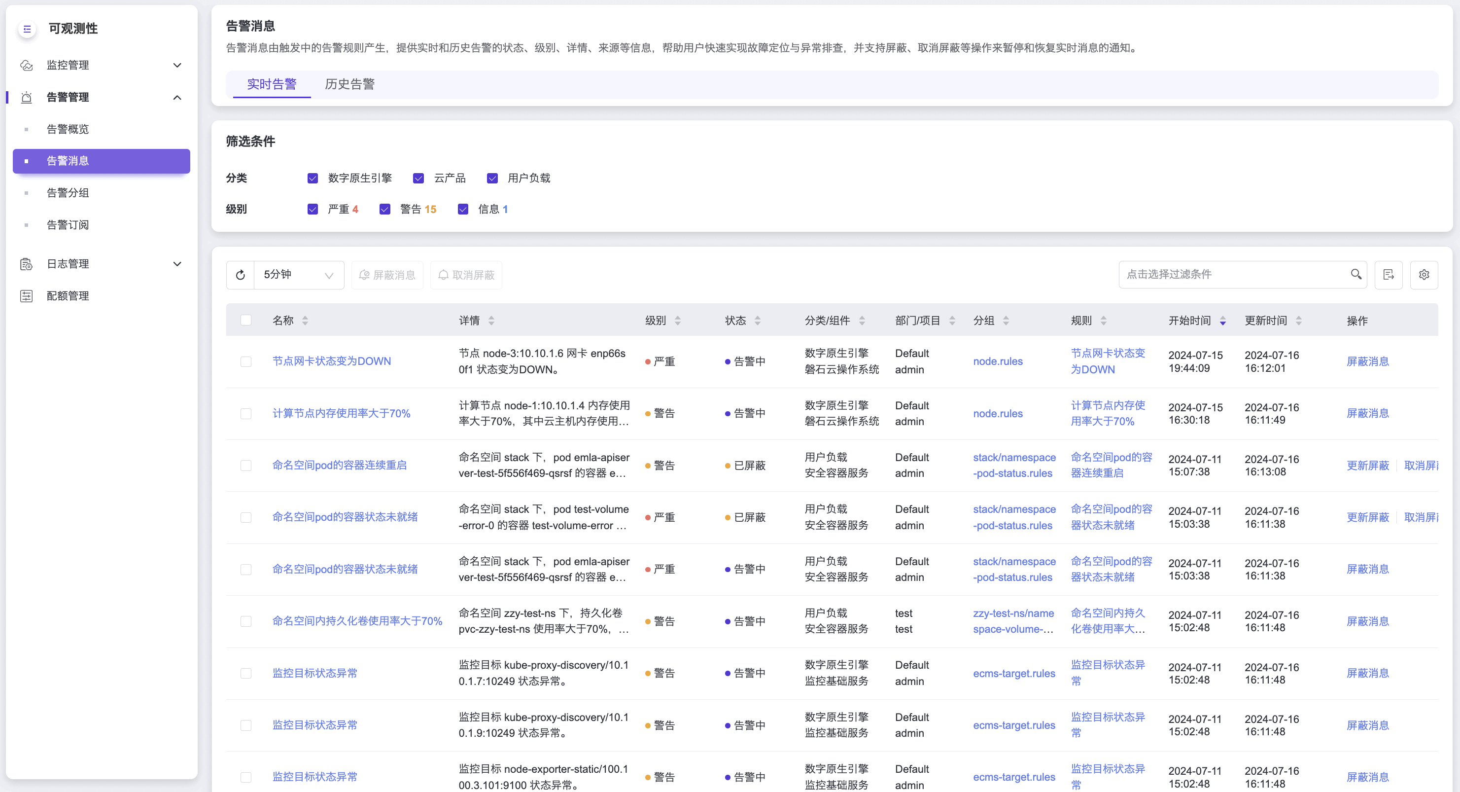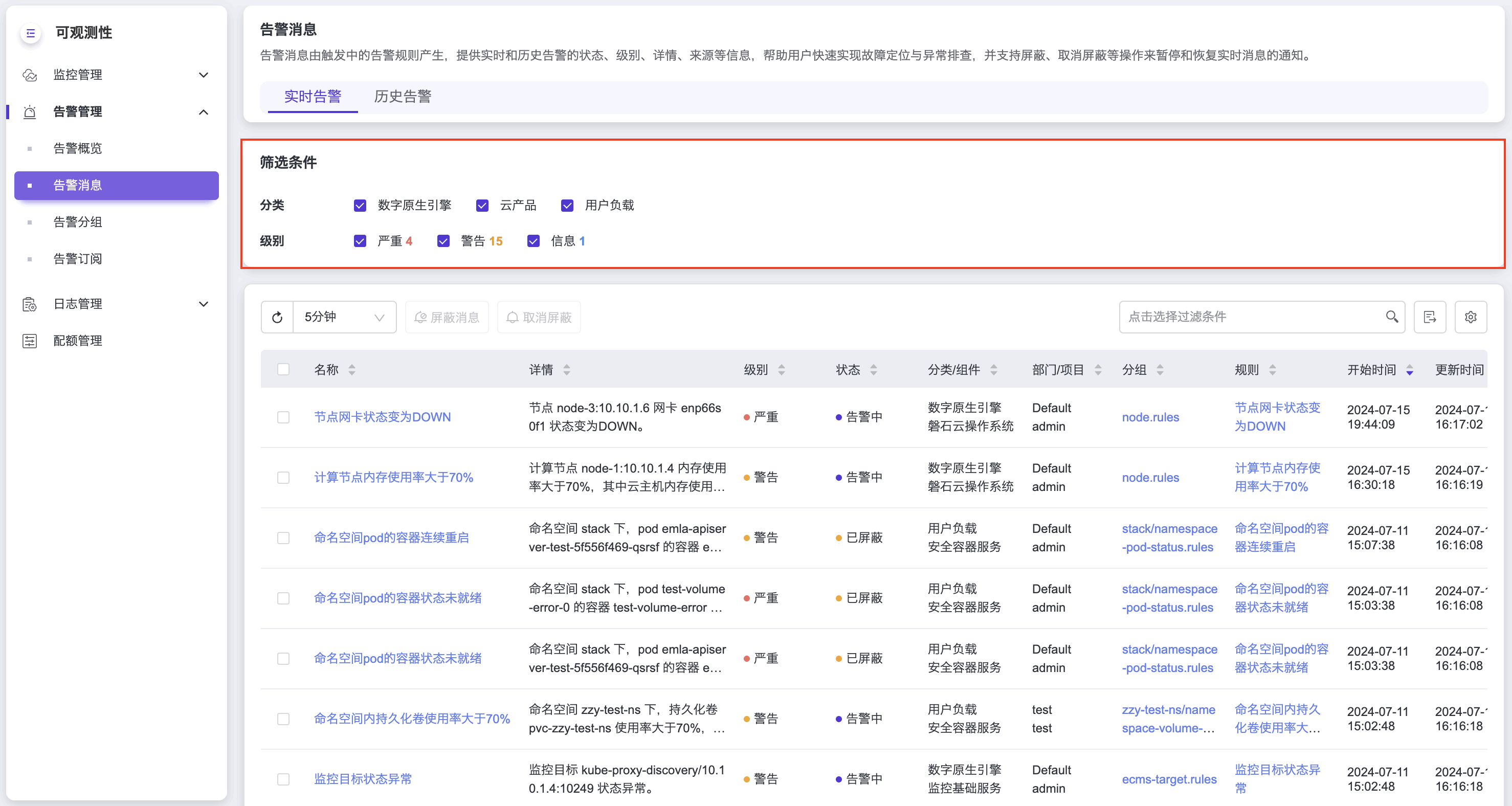 实时告警页签展示的是正在告警的告警消息,筛选条件下方的是实时告警列表,包括告警消息的名称、详情、级别、状态、分类、组件、所属部门和项目(仅云管理员可见)、分组、规则、开始时间、更新时间和操作。