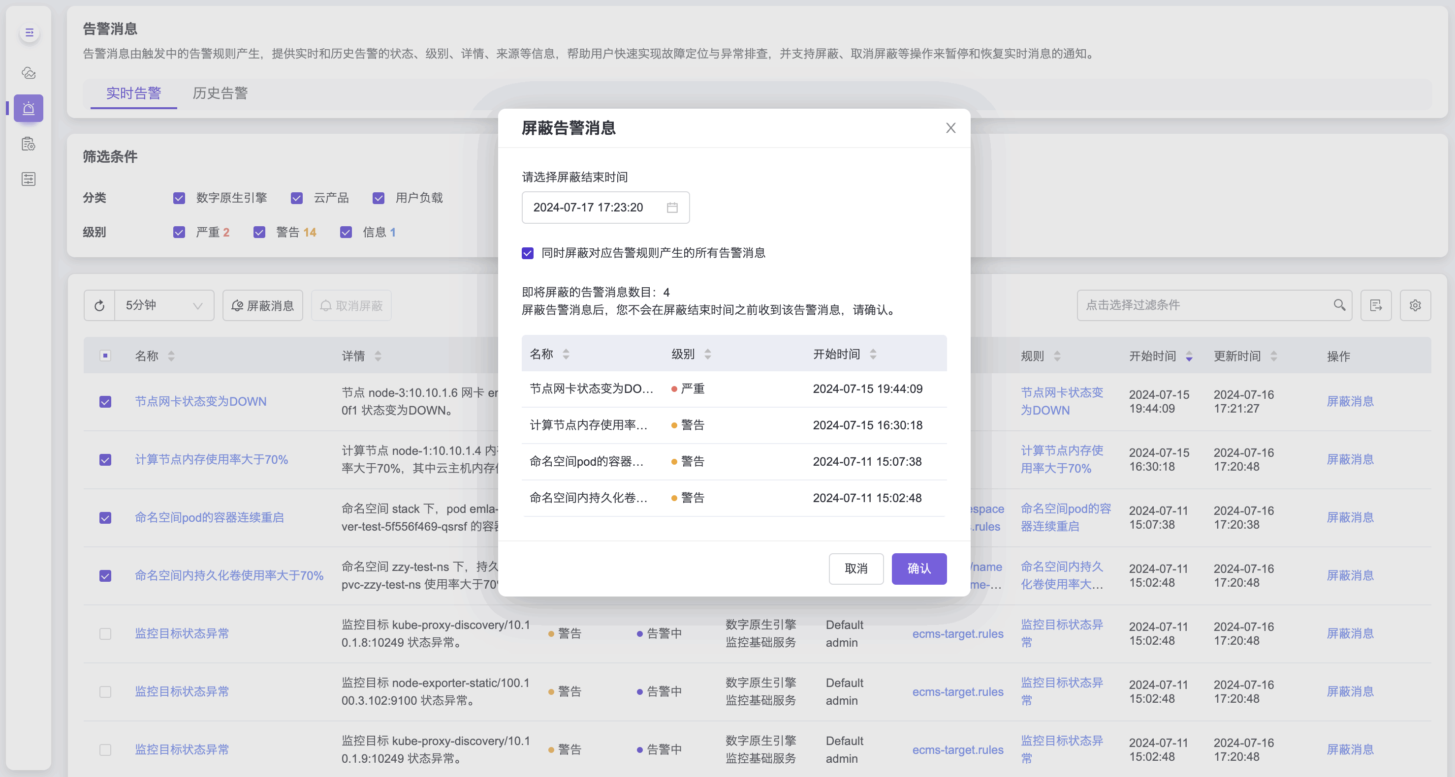 屏蔽消息操作可暂停实时告警消息的通知推送,操作后的告警消息状态将由告警中变为已屏蔽: