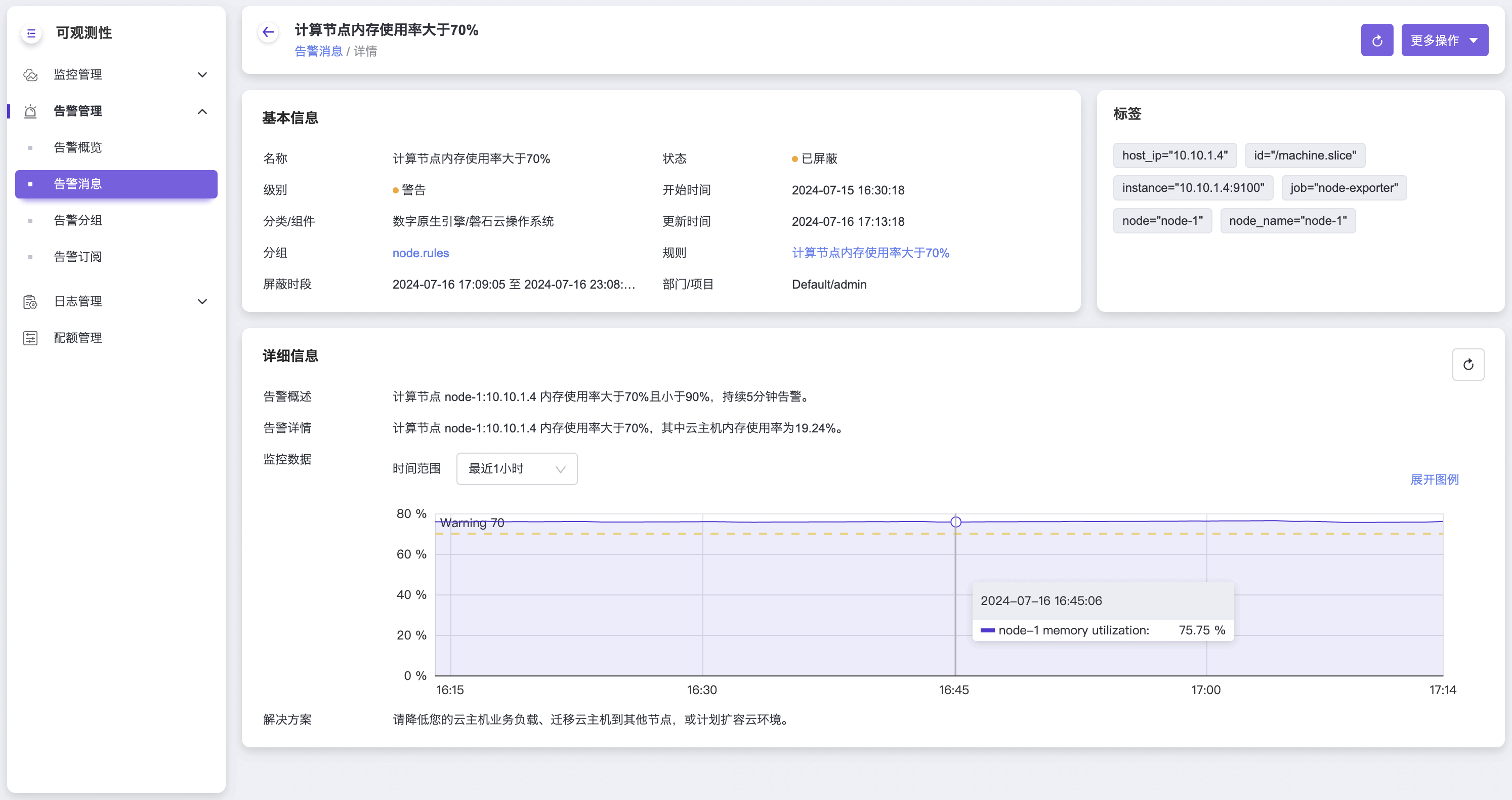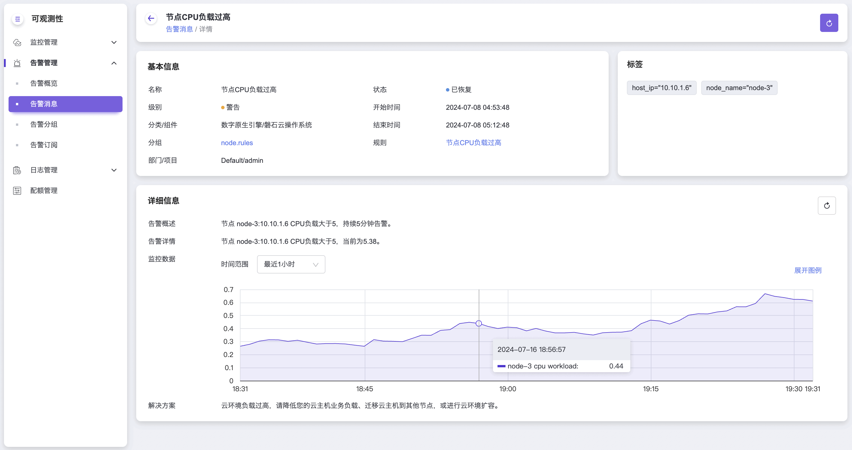 - 详细信息包括告警概述、告警详情、监控数据和解决方案。