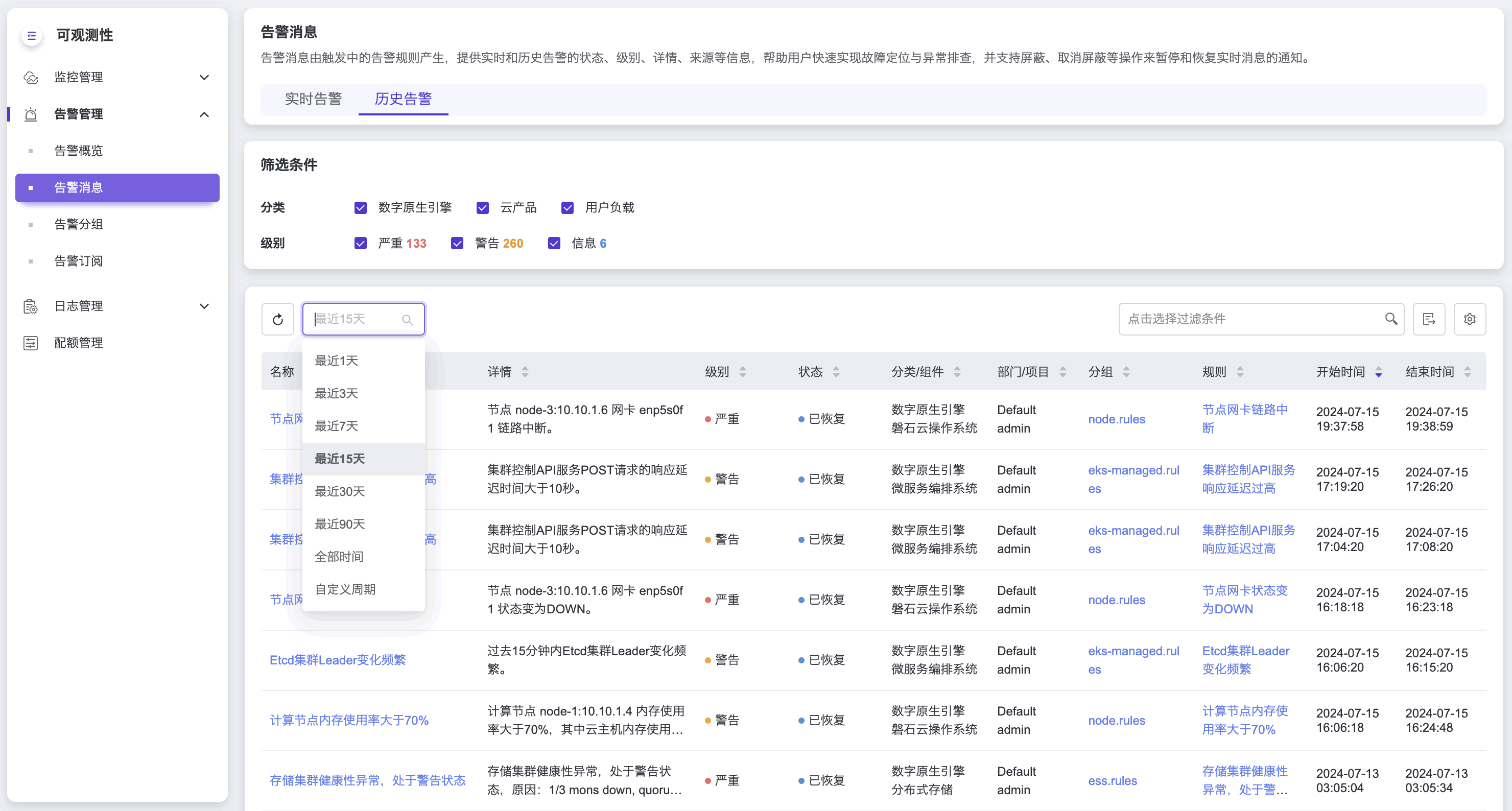 历史告警页签展示的是已恢复的告警消息,筛选条件下方的是历史告警列表,包括告警消息的名称、详情、级别、状态、分类、组件、所属部门和项目(仅云管理员可见)、分组、规则、开始时间和结束时间。