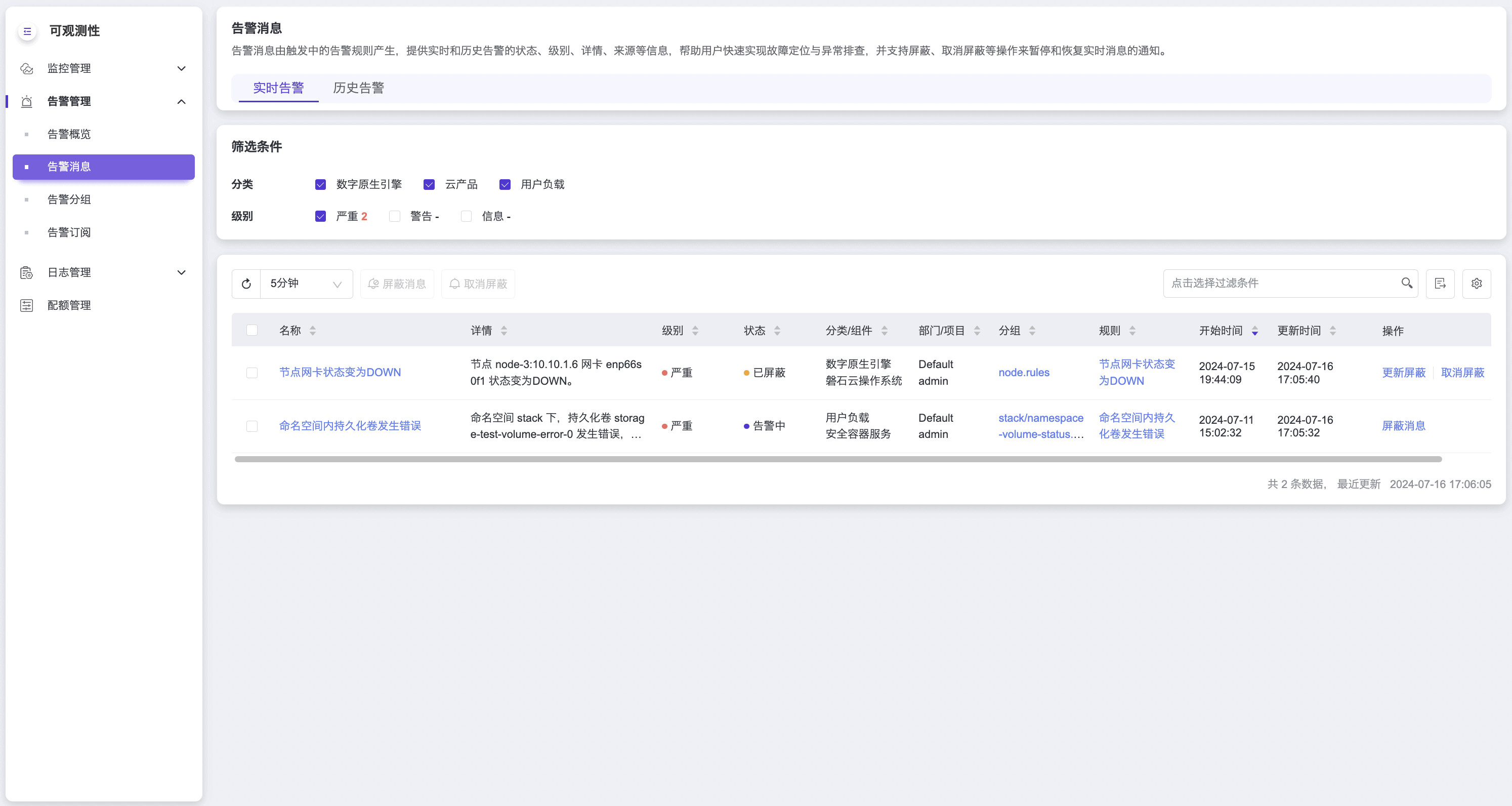本章节主要介绍在告警消息页面中,针对实时告警、历史告警的基本信息说明和屏蔽与取消屏蔽实时消息的操作说明,以辅助用户快速识别和定位故障。其中,在云平台的顶部导航栏中,依次选择[产品与服务]-[可观测性]-[告警管理]后,在左侧导航栏中选择[告警消息],即可访问“告警消息”页面。