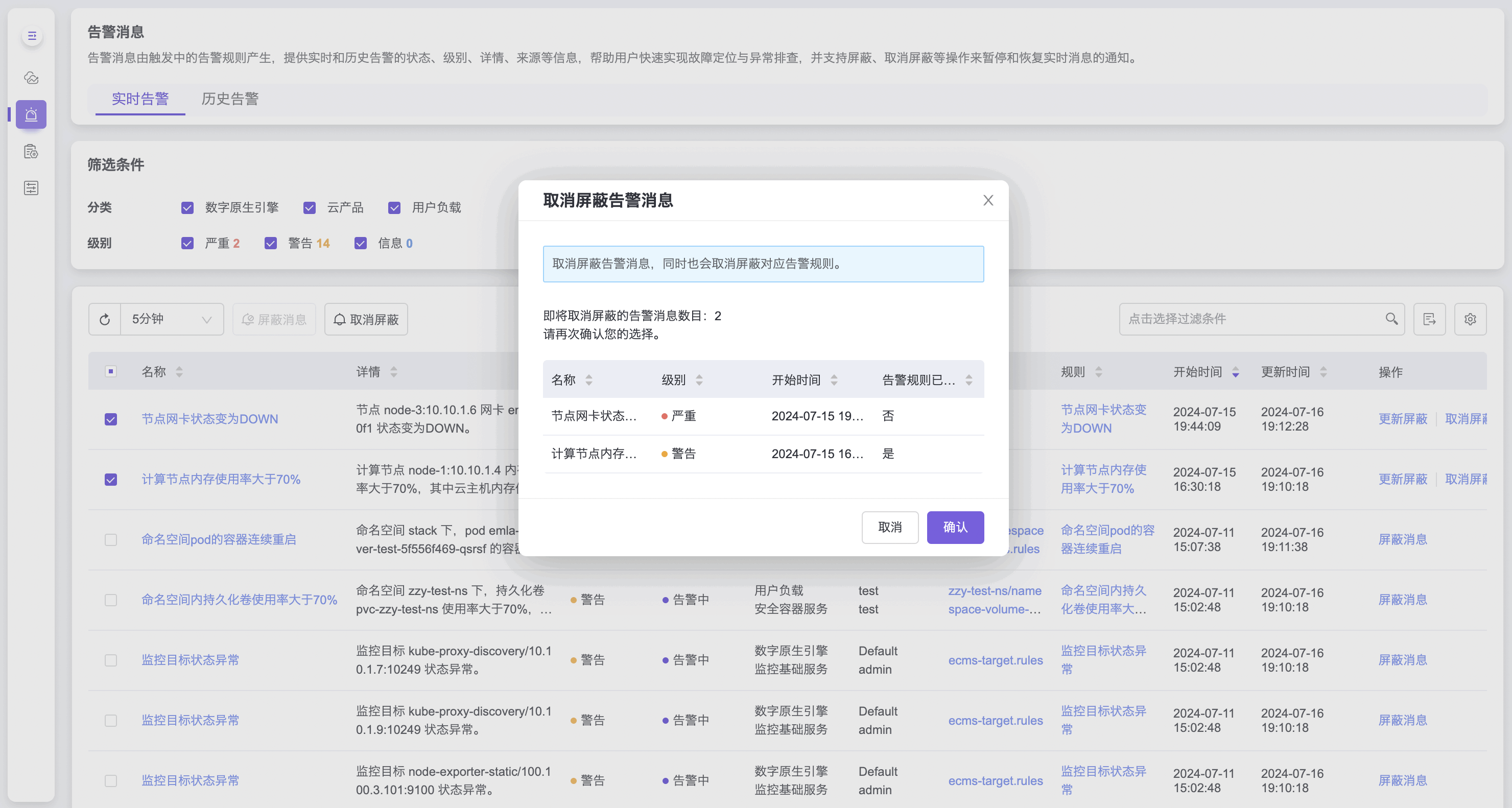 取消屏蔽操作将恢复实时告警消息的通知,操作后的告警消息状态将由已屏蔽变为告警中: