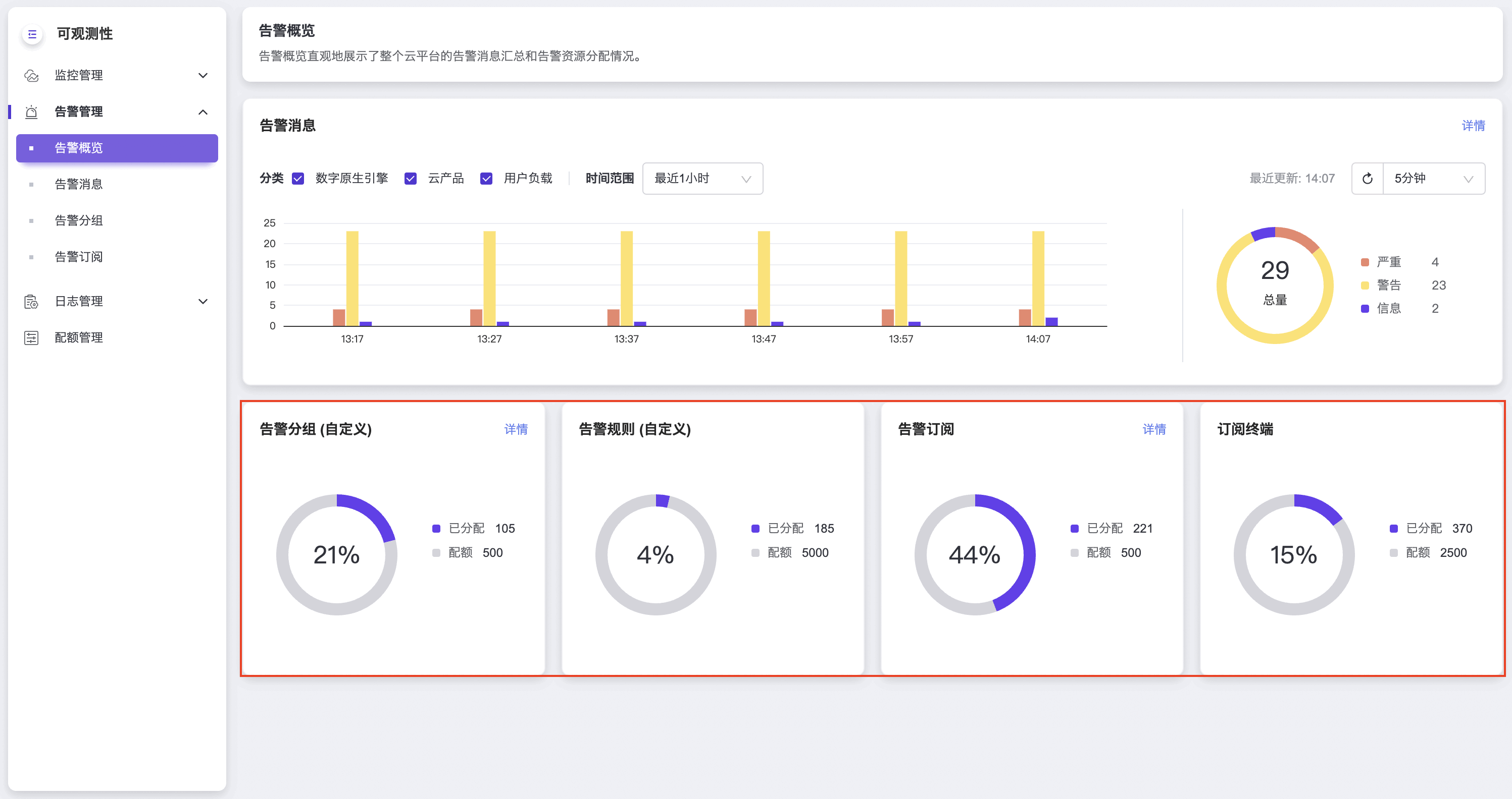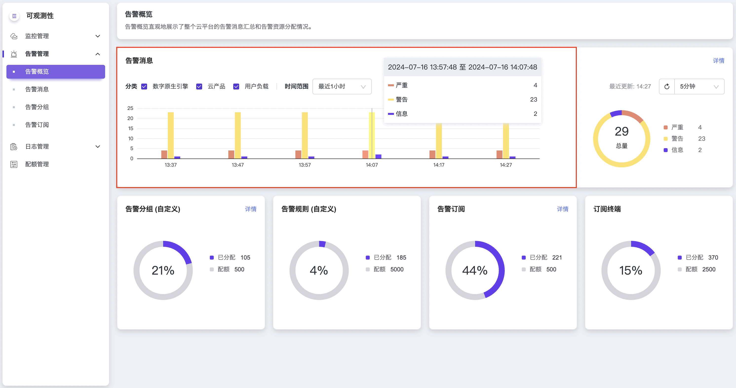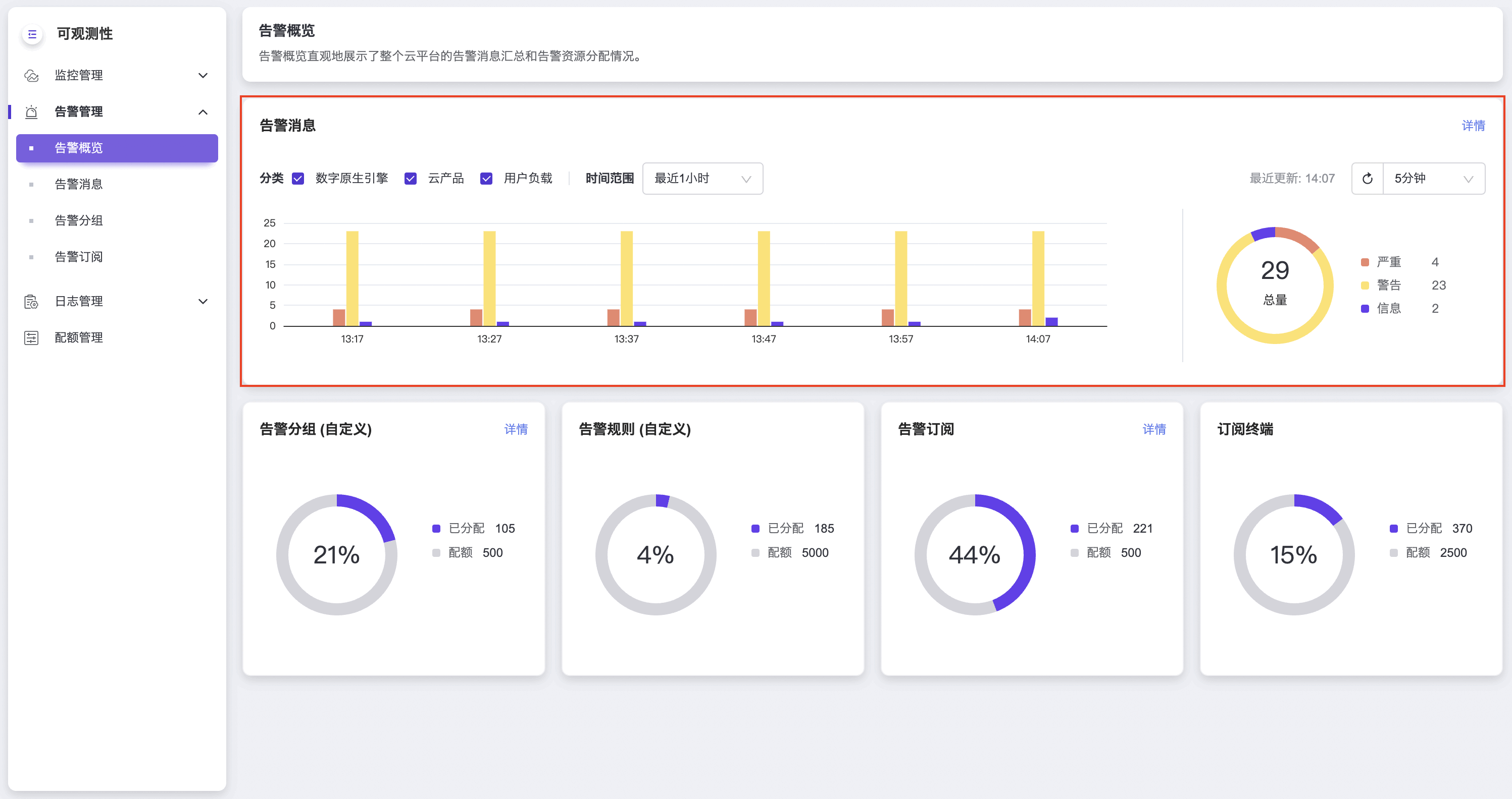 本章节主要介绍在告警概览页面中,针对云平台或项目整体告警资源信息的概括说明,帮助用户快速了解告警消息统计和配额分配情况,包括告警消息时间和级别分布,告警分组(自定义)、告警规则(自定义)、告警订阅和订阅终端配额分配。其中,在云平台的顶部导航栏中,依次选择[产品与服务]-[可观测性]-[告警管理]后,在左侧导航栏中选择[告警概览],即可访问“告警概览”页面。