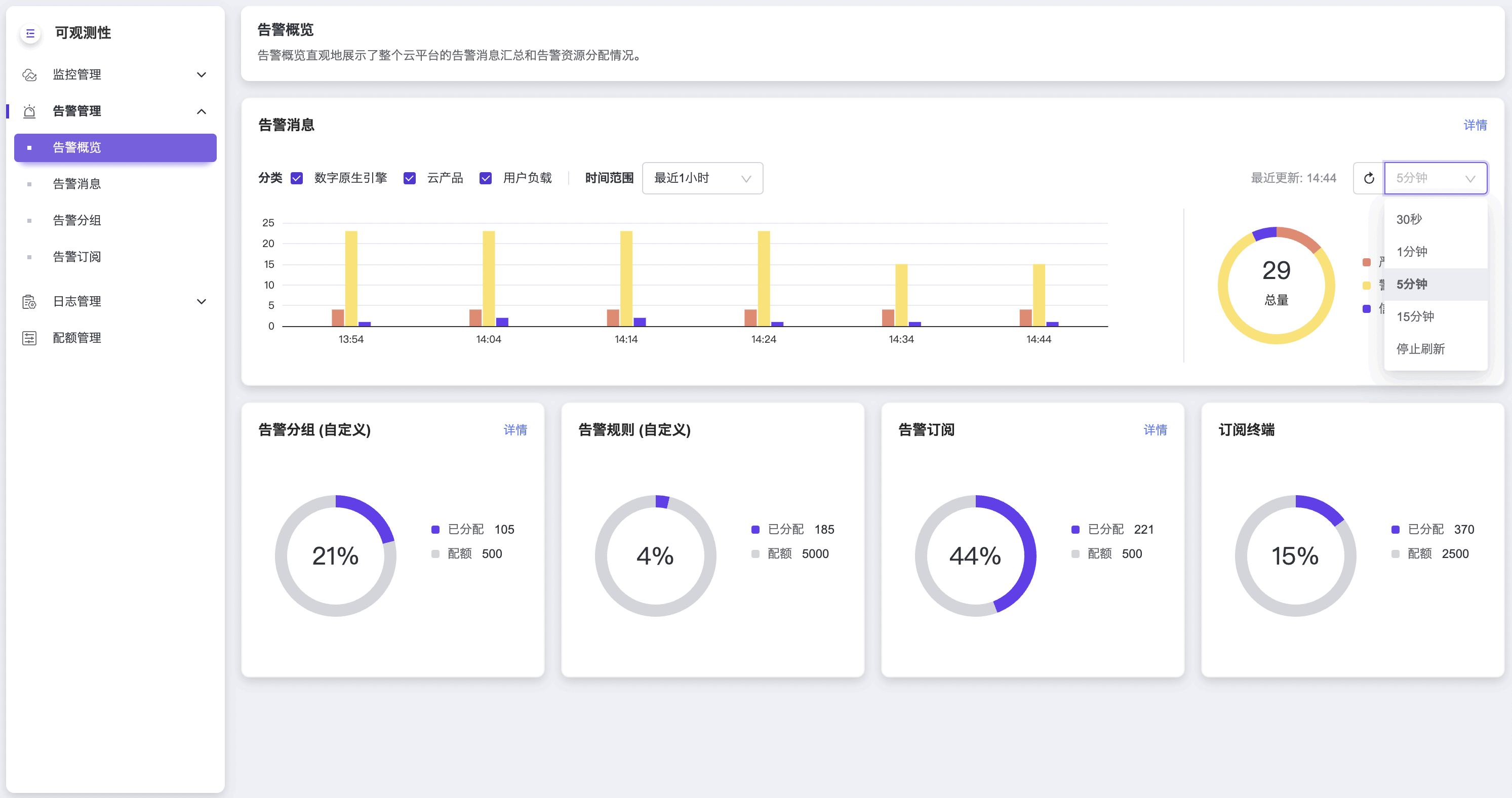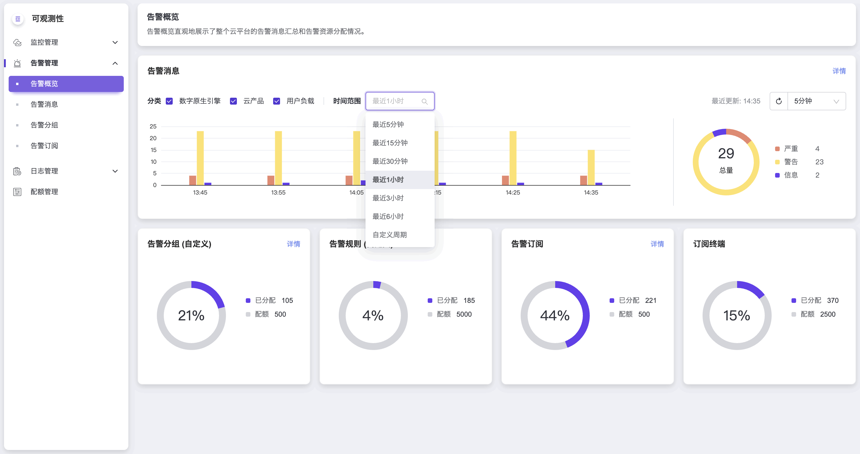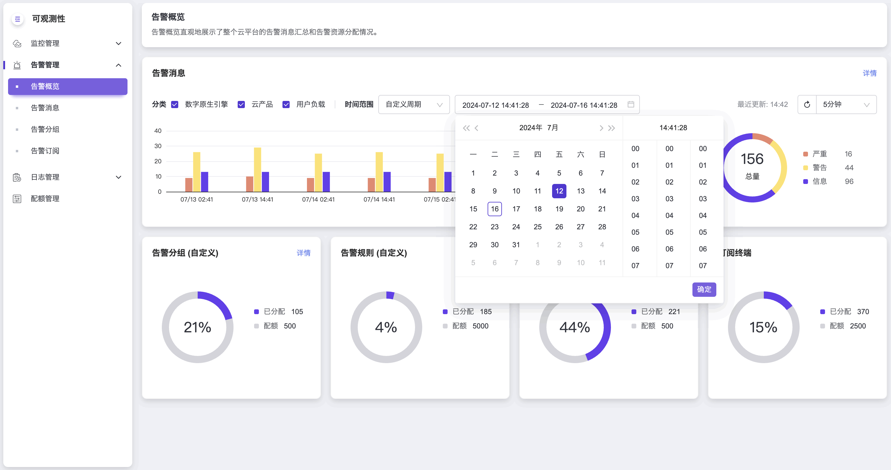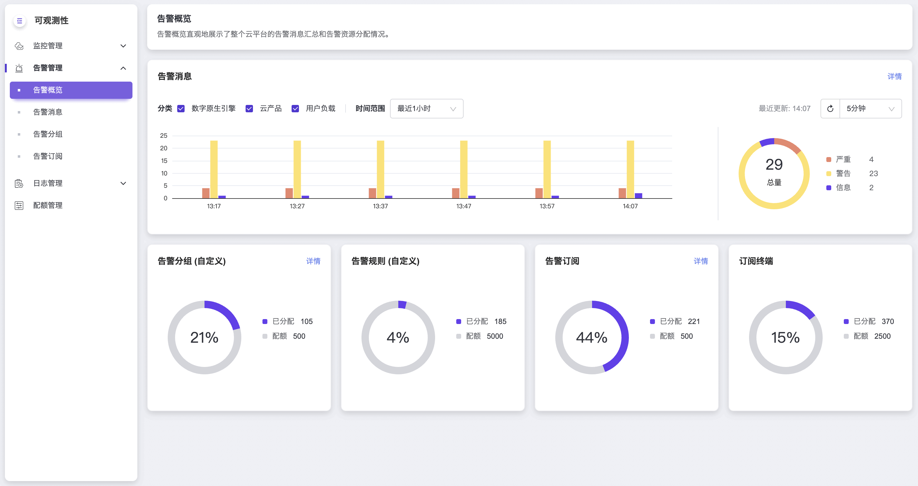 本章节主要介绍在告警概览页面中,针对云平台或项目整体告警资源信息的概括说明,帮助用户快速了解告警消息统计和配额分配情况,包括告警消息时间和级别分布,告警分组(自定义)、告警规则(自定义)、告警订阅和订阅终端配额分配。其中,在云平台的顶部导航栏中,依次选择[产品与服务]-[可观测性]-[告警管理]后,在左侧导航栏中选择[告警概览],即可访问“告警概览”页面。