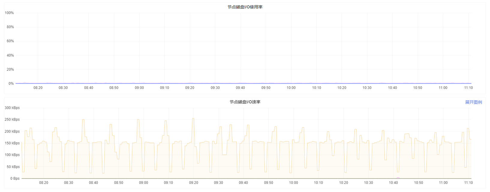 节点磁盘I/O速率:该图表显示当前节点上所有磁盘的读写I/O速率。将鼠标移动到图表上,可以分别看到每块盘读写的I/O速率。