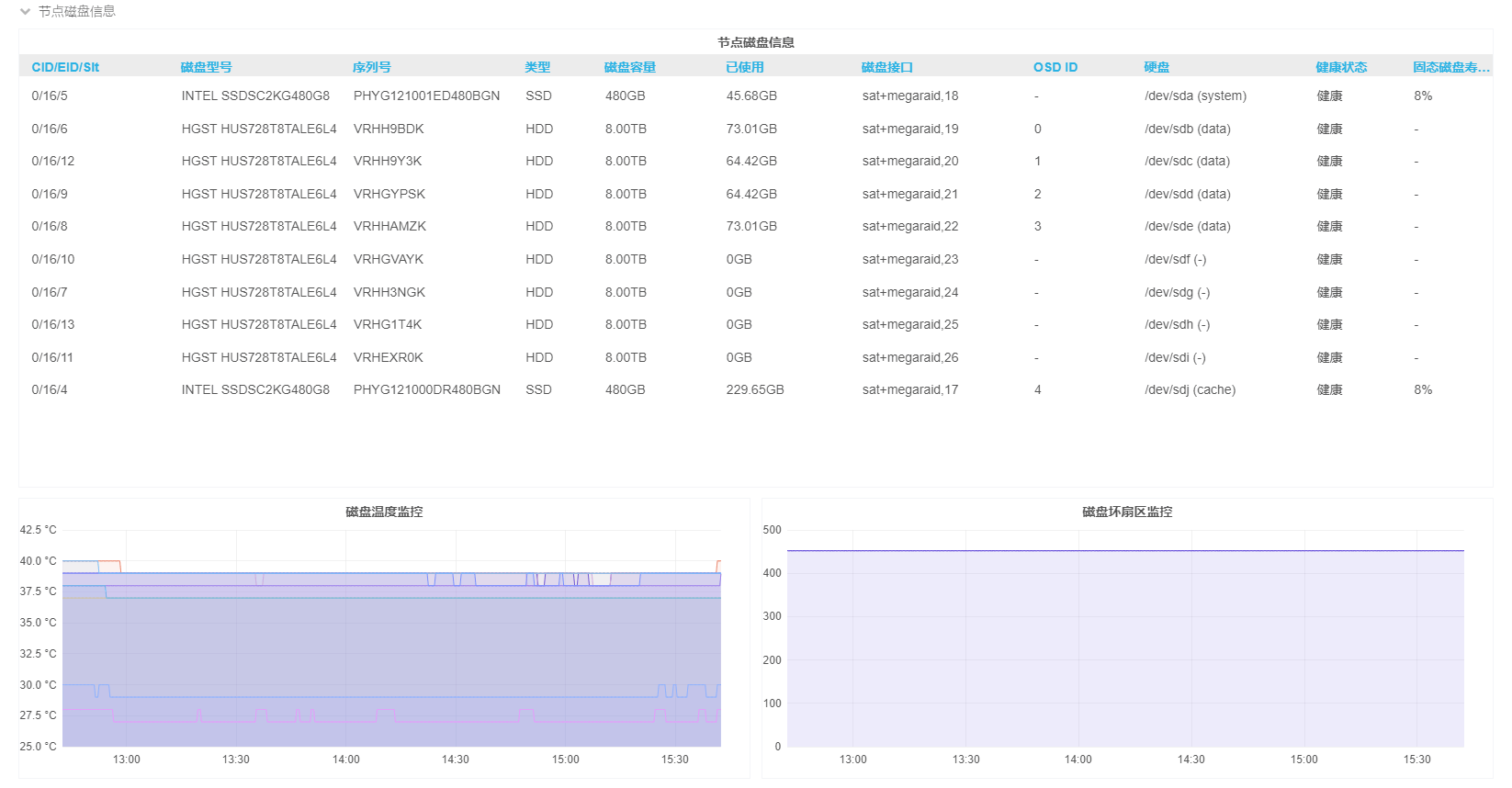 节点磁盘信息 记录所有磁盘的运行健康状态、使用时长、温度监控以及磁盘损坏监控等。