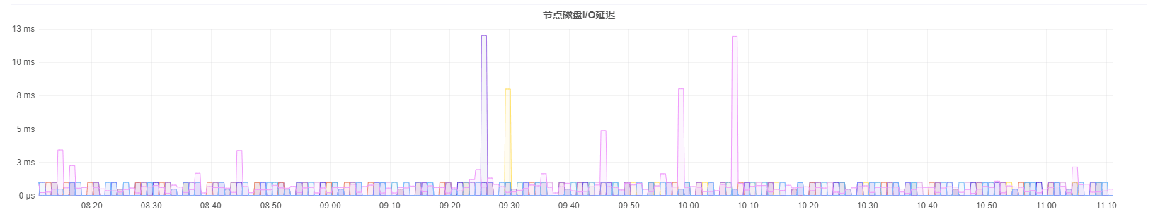 节点磁盘I/O延迟:该图表显示当前节点上所有磁盘的读写I/O延迟速率。将鼠标移动到图表上,可以分别看到每块盘读写的I/O延迟速率。