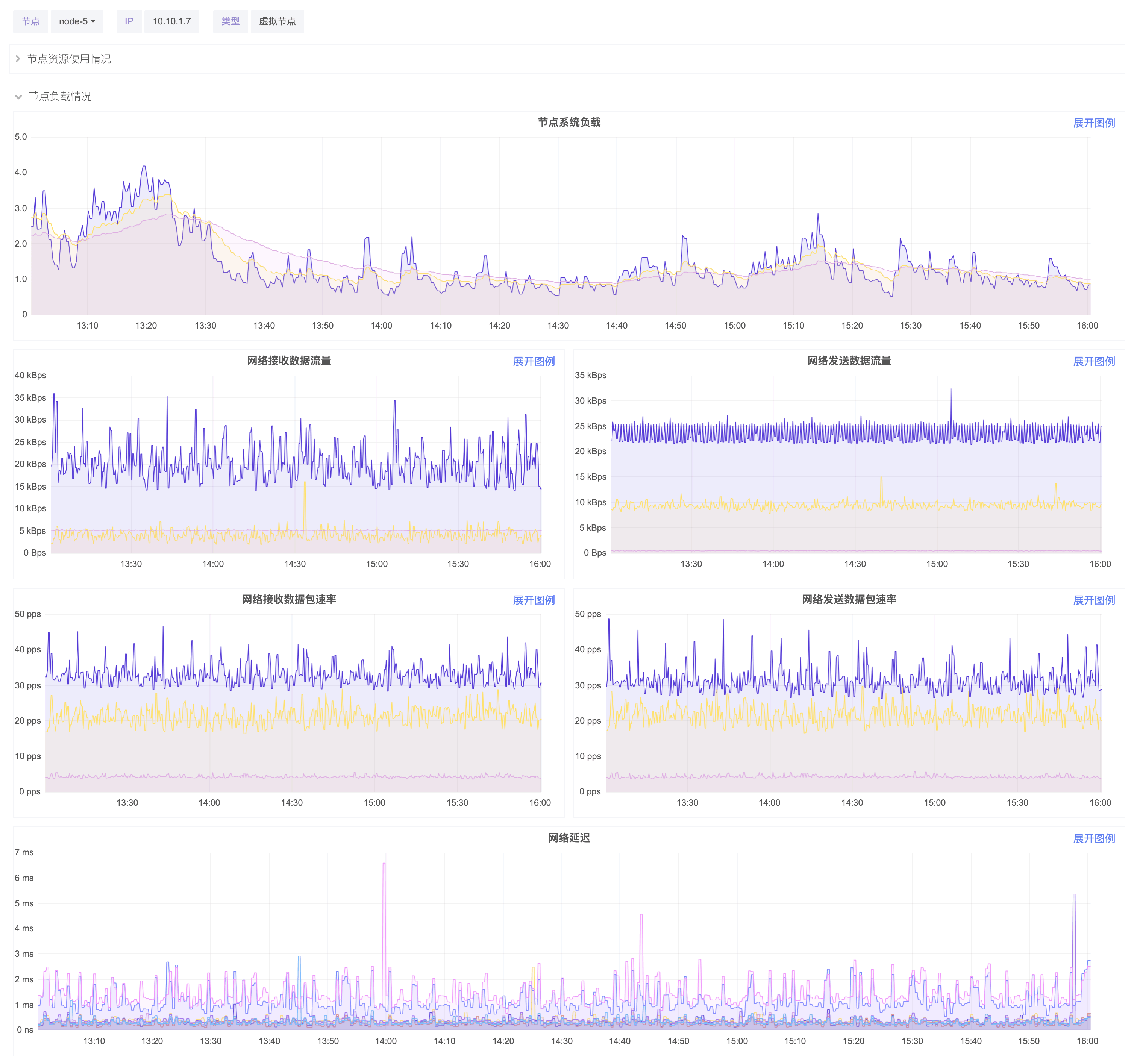 节点负载情况 页面包括 节点系统负载 数据,网络接收数据流量,网络发送数据流量,网络接收数据包速率,网络发送数据包速率,网络延迟。