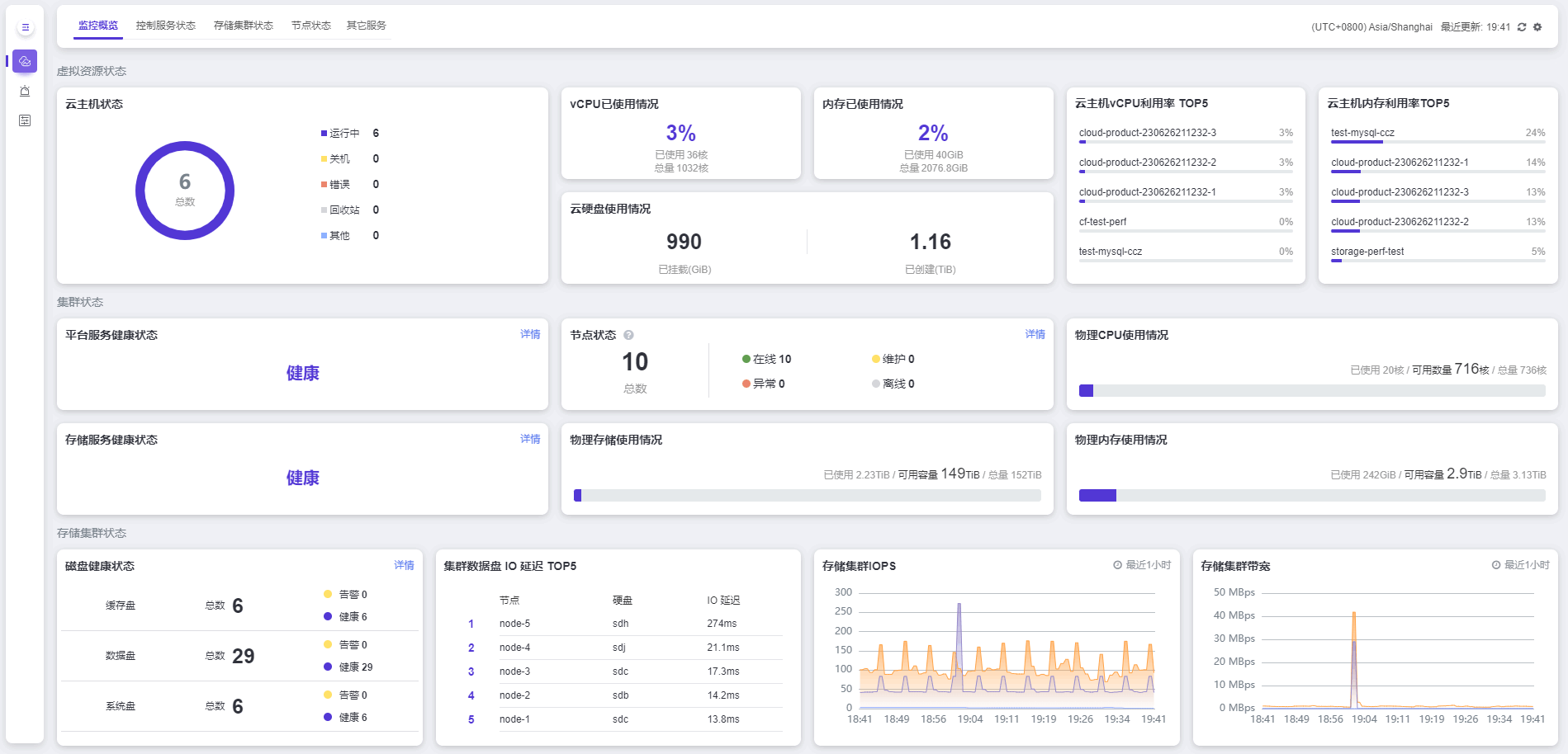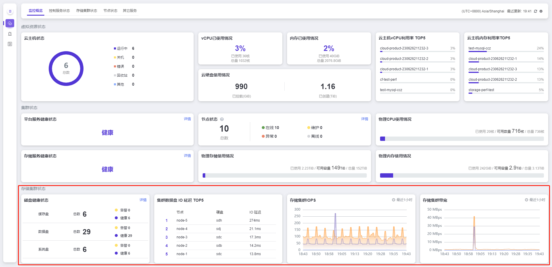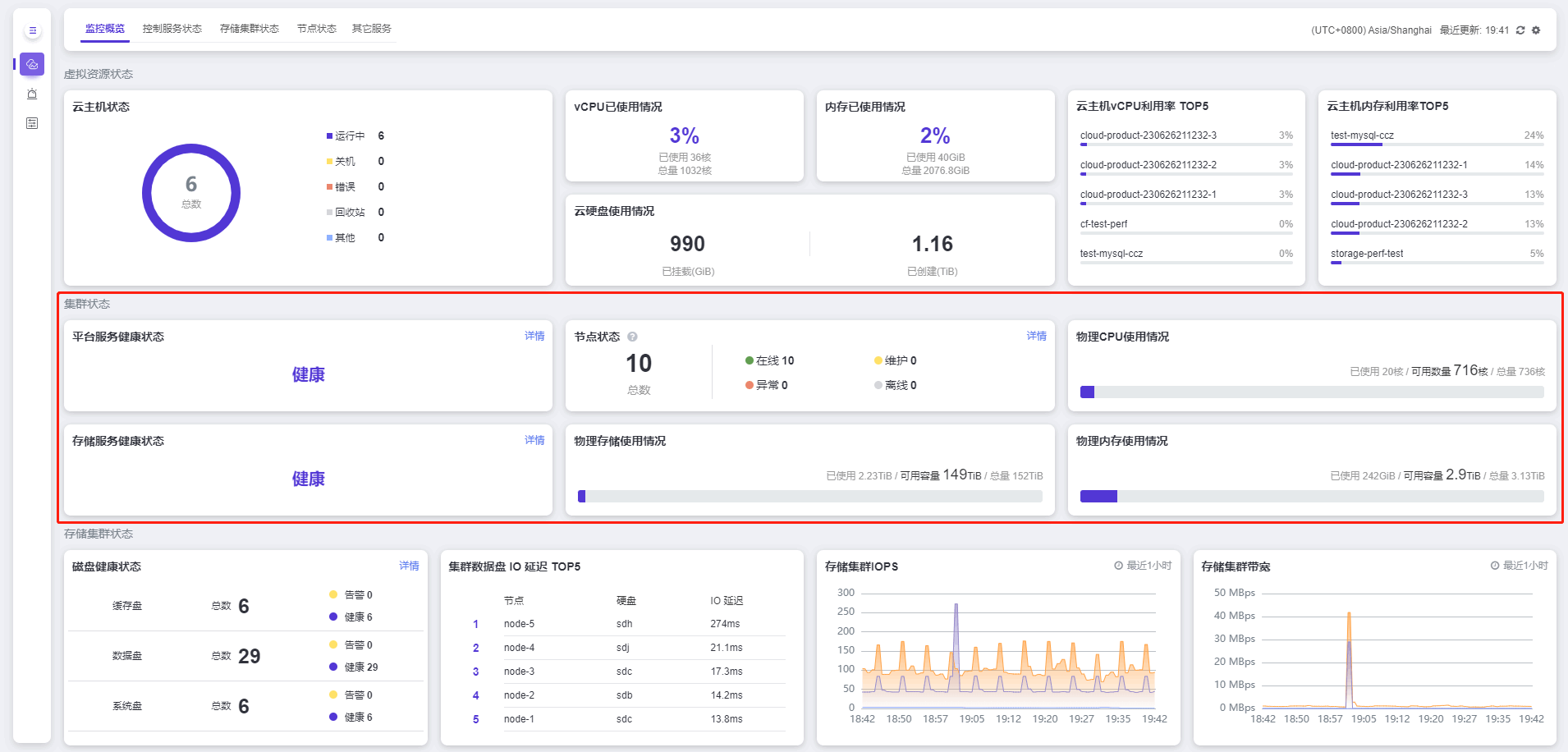 存储集群状态 展示集群中缓存盘、数据盘及系统盘的总数和相应的健康状态,集群数据盘IO 延迟 Top5、存储集群IOPS 以及 存储集群的读写带宽。
