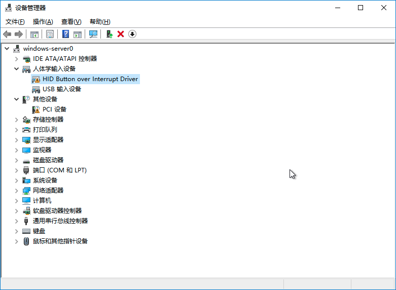 在虚拟机内打开设备管理器(Device Manager),发现”HID Button over Interrupt Driver”驱动显示一个警告符。