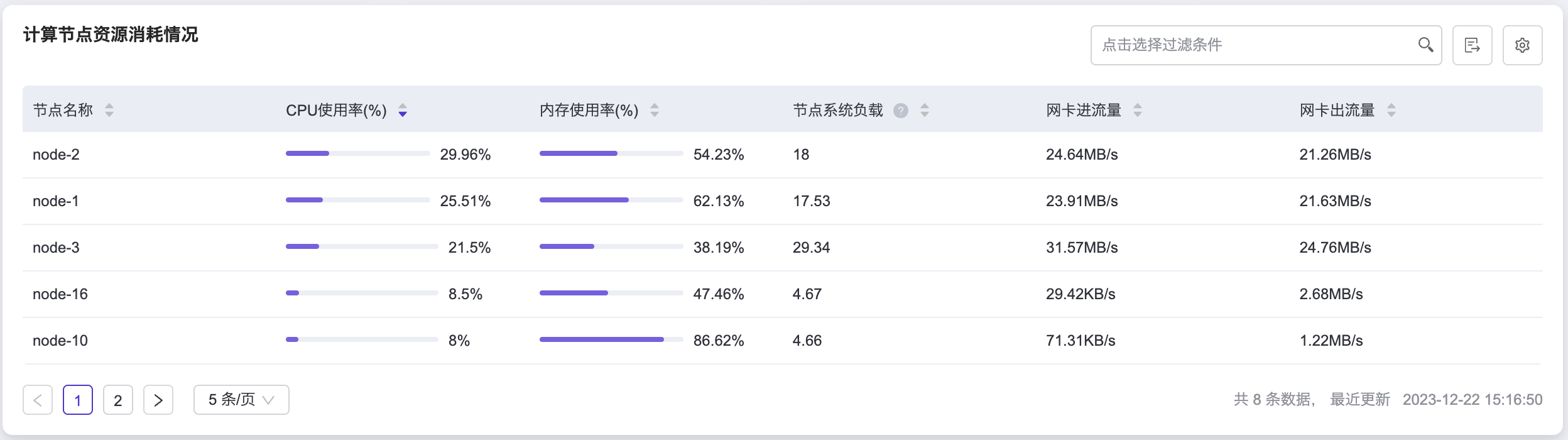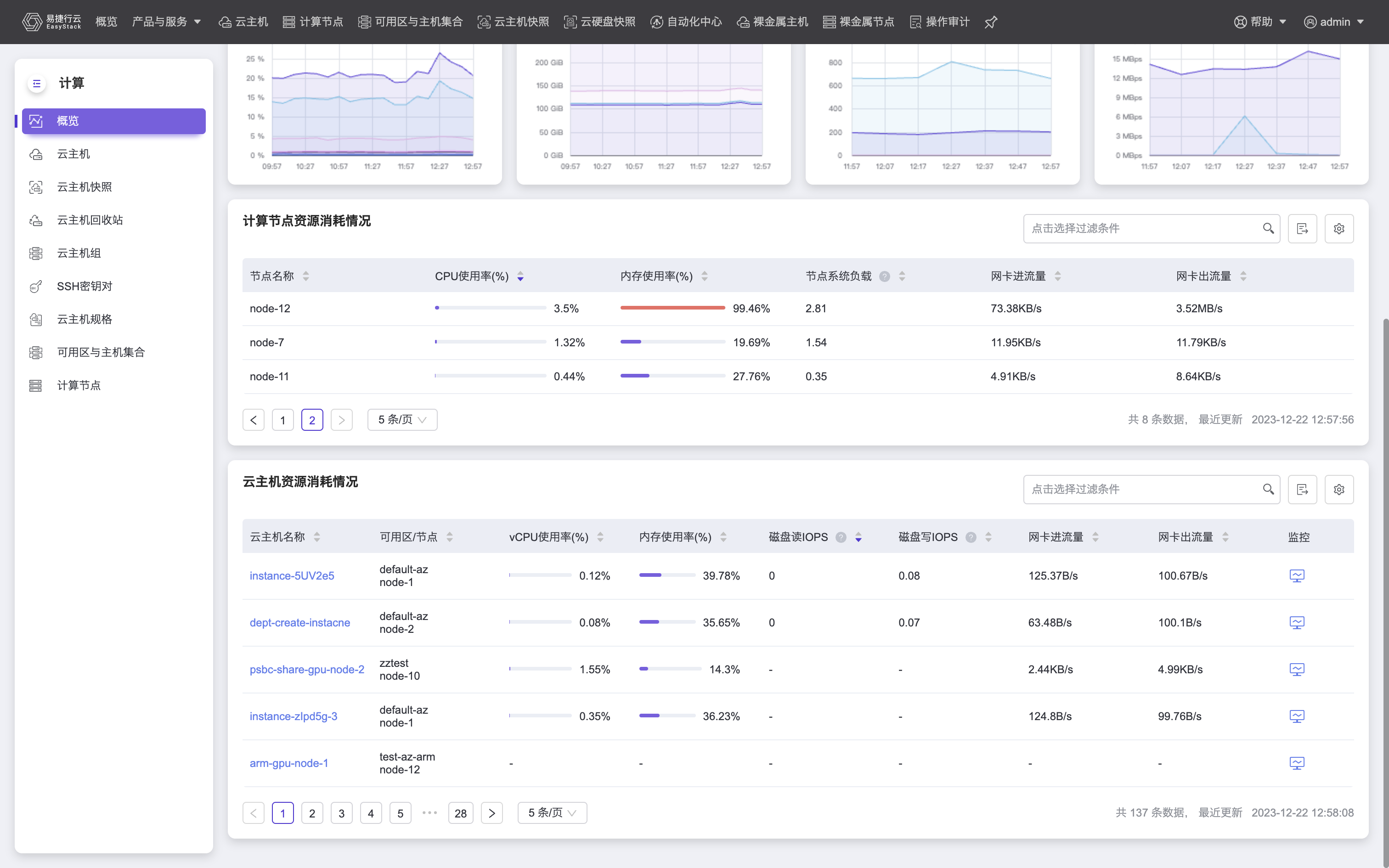 - 平台所有计算节点资源使用情况列表:如下图所示,该模块为云管理员展示了平台中所有计算节点资源使用情况并支持数据导出,包括CPU使用率、内存使用率、节点系统负载、网卡进出流量等,可将鼠标hover在进度条上显示更多的指标数据,每一项指标均支持正向、逆向排序。该模块每五分钟自动刷新。