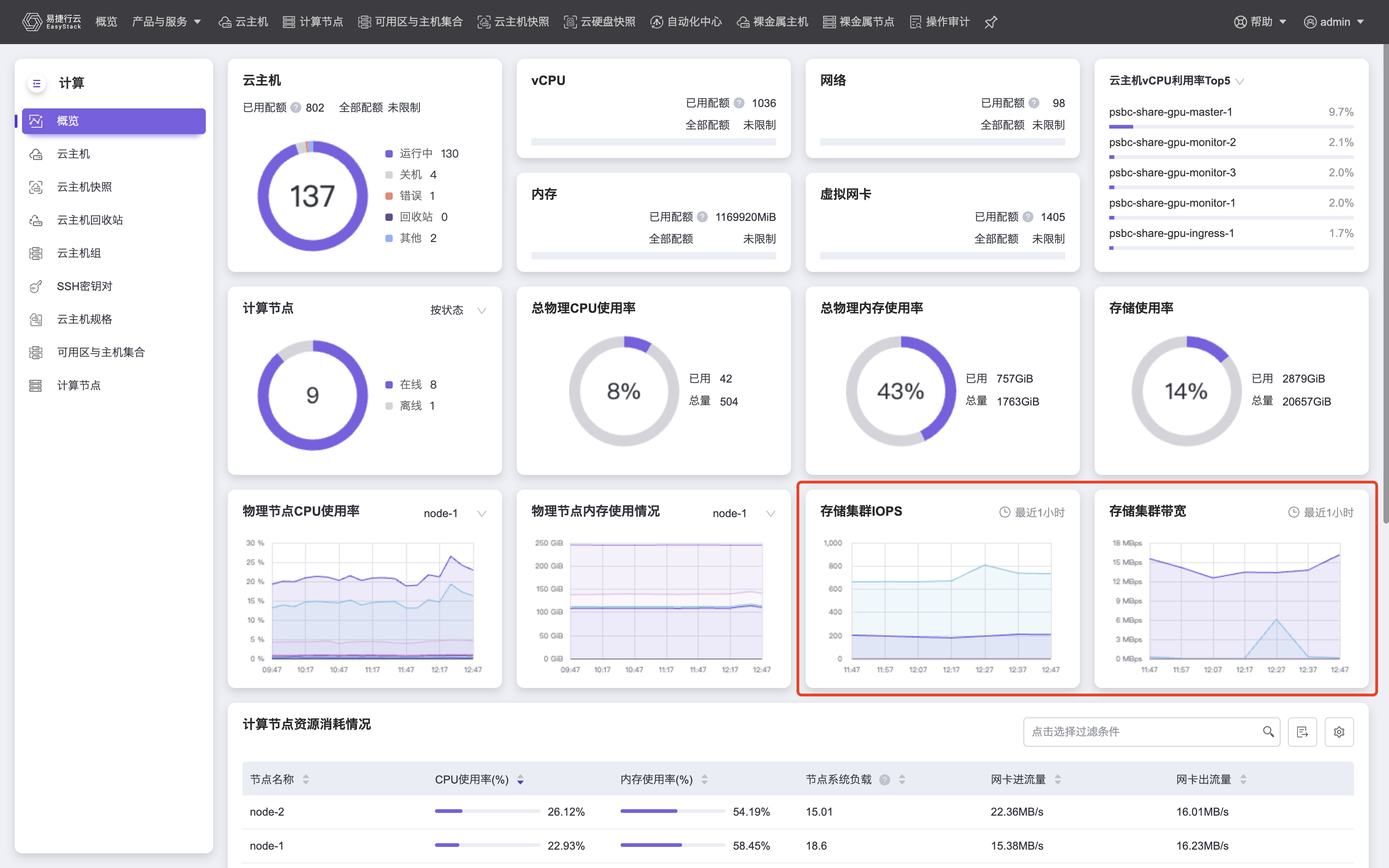 物理资源状态 对应图中标红区域,是对平台中物理资源的概况展示,只对云管理员开放,如果您是非云管理员角色,将无法获取物理资源状态信息。物理资源状态展示项中您可以清晰查看节点在线/离线等状态、物理CPU/内存/存储使用情况等。物理资源状态也可以帮助您一目了然的了解到集群的物理资源使用情况,当资源不足时,需要尽快扩容或清理资源。