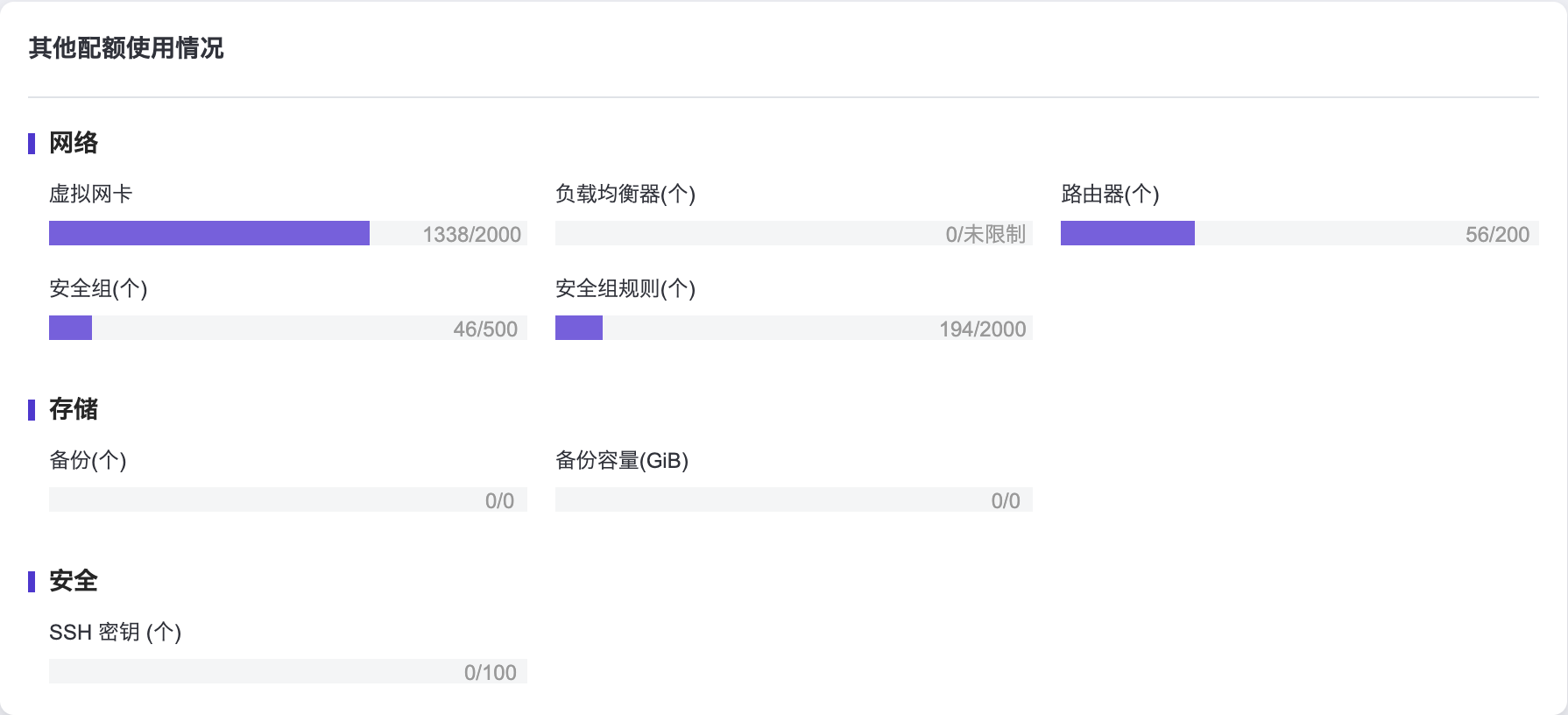对于非云管理员角色的用户,概览页面在虚拟资源状态中增加如下面两张图所示的“云硬盘”和“其他网络配额使用情况”模块,“云硬盘”模块可按照云硬盘类型查看项目中使用的云硬盘资源,包括容量利用率、云硬盘总数、云硬盘快照总数等,“其他网络配额使用情况”模块可展示网络、存储以及安全相关的配额使用情况,方便您根据页面中展示出的数据合理利用资源。