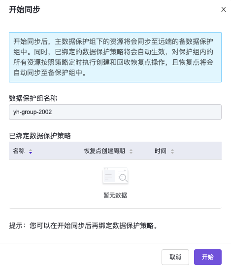 • 保护组内的全部资源实际存在,若有资源已被删除将导致开始同步失败。需将资源移除后再进行本操作。