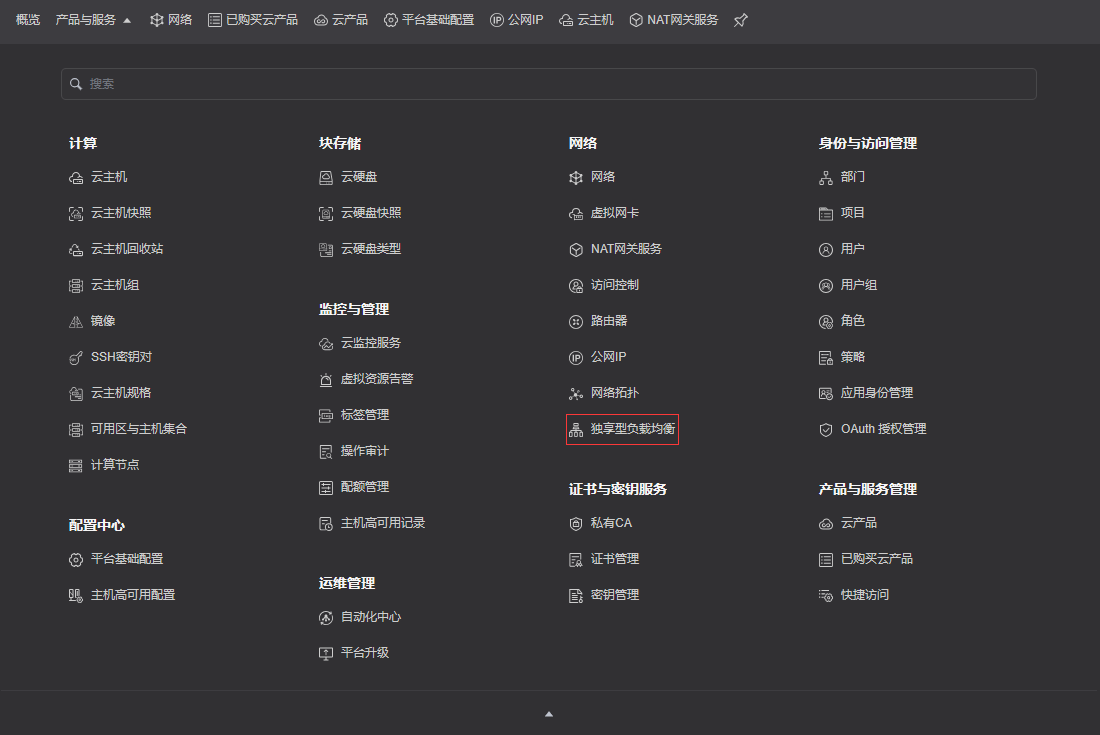 云产品升级完成后,即可使用云产品提供的新功能。在云平台的顶部导航栏中,依次选择[网络]-[独享型负载均衡],就可以看到产品相应功能了。如图: