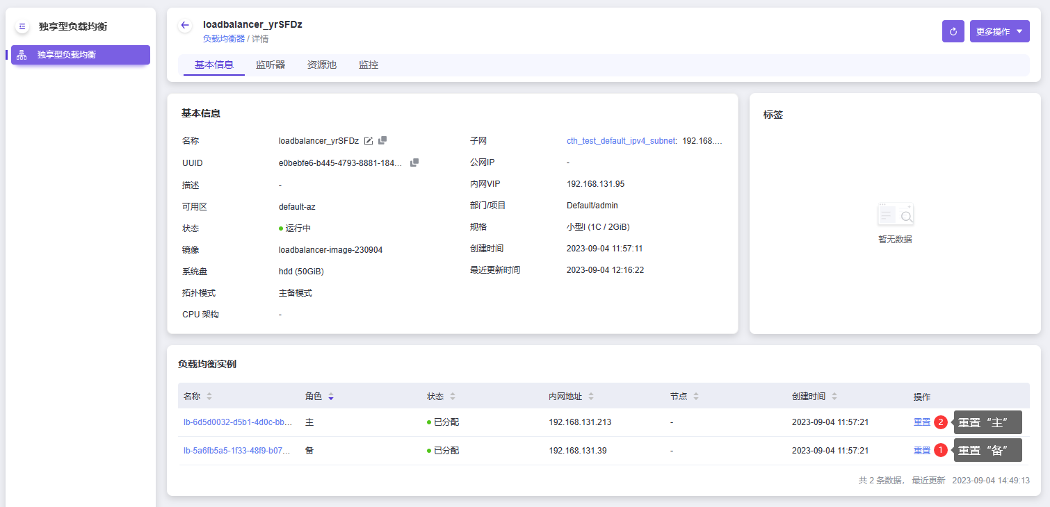 实例升级需要使用云管理员账号登陆平台,在云平台的顶部导航栏中,依次选择[网络]-[独享型负载均衡],进入负载均衡列表页。在负载均衡器列表页点击一个待升级的负载均衡器,进入负载均衡器详情页,依次对角色为“备”和“主”的负载均衡实例进行重置。重置“主”时,会造成1秒以内的服务中断。如图: