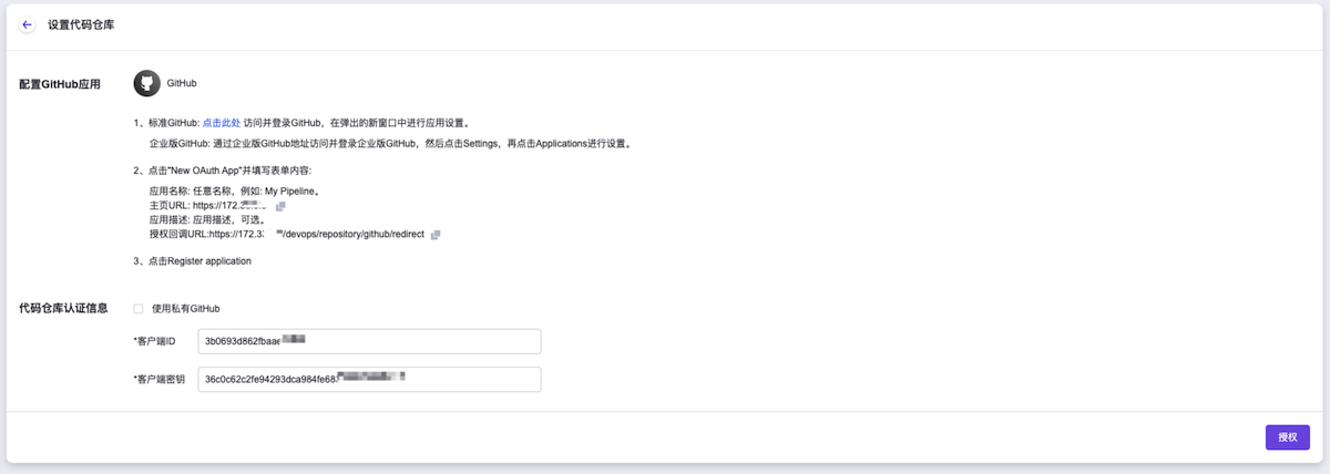 3. 在“设置代码仓库”页面中,按照如下说明输入代码仓库认证信息后,单击 授权 ,跳转至代码仓库的授权页面,单击 Authorize ,完成授权并返回云平台设置代码仓库页面。