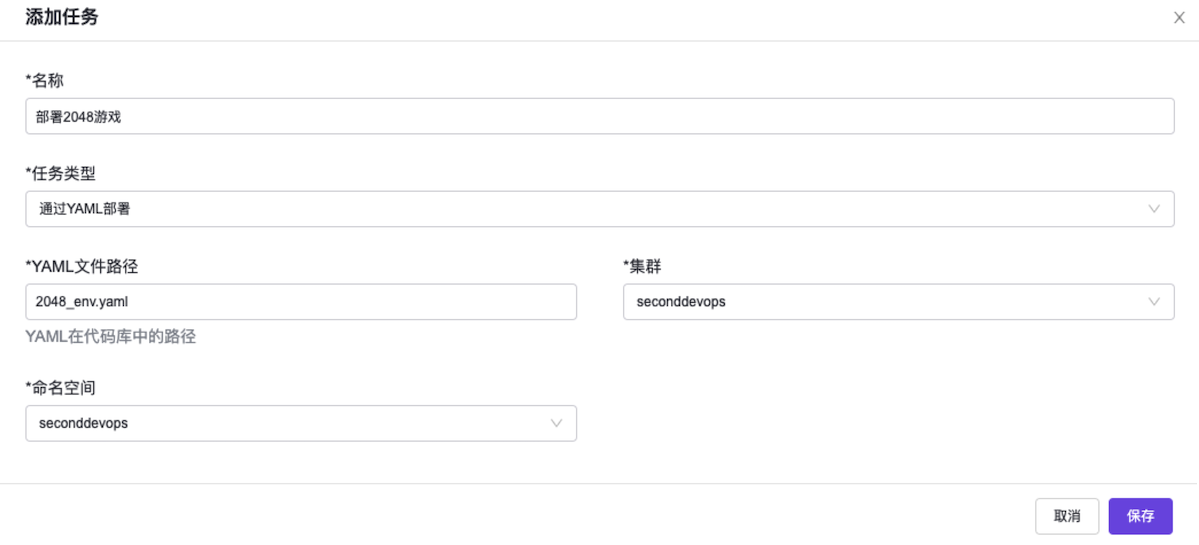 添加任务,弹出“添加任务”对话框。在该对话框中,“任务类型”选择“通过YAML部署”,“YAML路径”输入“2048_env.yaml”,并配置名称和应用程序的部署目标集群及命名空间后,单击保存,完成任务创建,并关闭对话框。