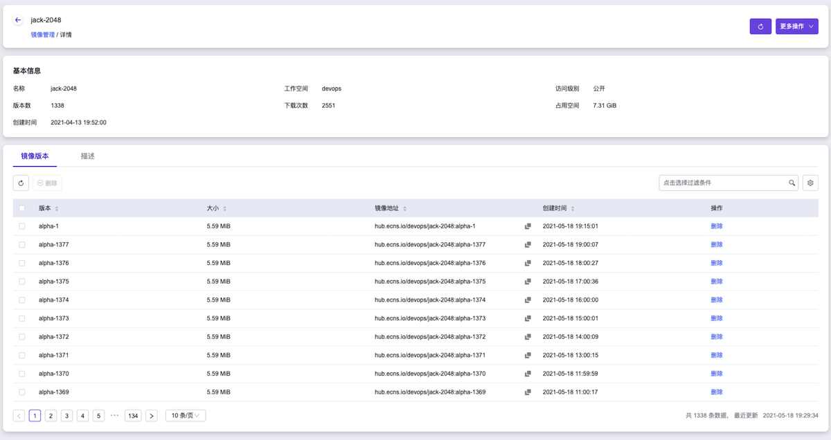在云平台的顶部导航栏中,依次选择[产品与服务]-[容器服务]-[容器镜像服务],进入“镜像管理”页面。在该页面中,确认已生成名为“jack-2048”的镜像文件。然后,单击此镜像文件名称,进入其详情页面后,在[镜像版本]页签中,确认该镜像文件的生成版本为“alpha-<运行编号>”。