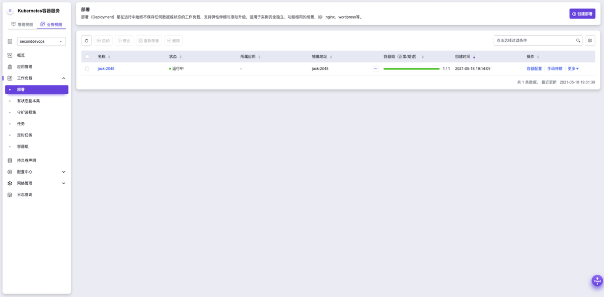 在云平台的顶部导航栏中,依次选择[产品与服务]-[容器服务]-[Kubernetes容器服务],进入Kubernetes容器服务页面后,再在该页面的左侧导航栏中,先选择“业务视图”以及该应用程序的所在项目、部署集群和命名空间,再选择[工作负载]-[部署],进入部署页面。在该页面中,确认已生成名为“jack-2048”的部署且状态为“运行中”。