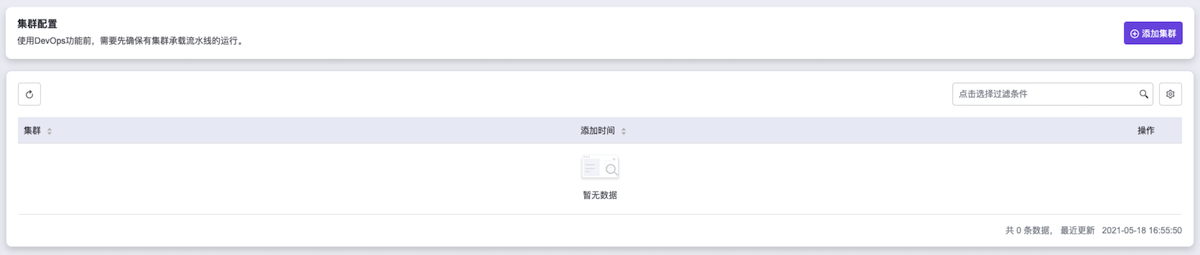 本操作用于为流水线配置承载其运行的Kubernetes集群,通过创建集群和添加集群两步骤,实现在指定Kubernetes集群中承载所有DevOps流水线的运行。