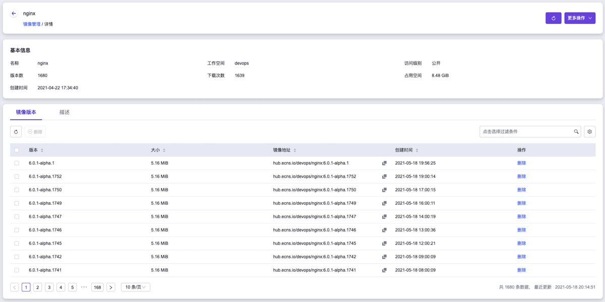 在云平台的顶部导航栏中,依次选择[产品与服务]-[容器服务]-[容器镜像服务],进入“镜像管理”页面。在该页面中,确认已生成名为“nginx”的镜像文件。然后,单击此镜像文件名称,进入其详情页面后,在[镜像版本]页签中,确认该镜像文件的生成版本为“6.0.1-alpha.<运行编号>”。