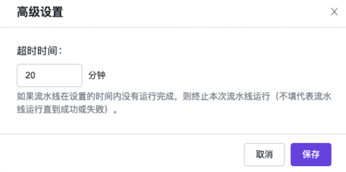 当前云平台中,高级设置项仅支持设置流水线超时时间,请根据客户实际业务需求酌情配置。当不配置超时时间(即超时时间为空)时,即表示流水线将在14天内持续执行直至成功或最终被自动停止。