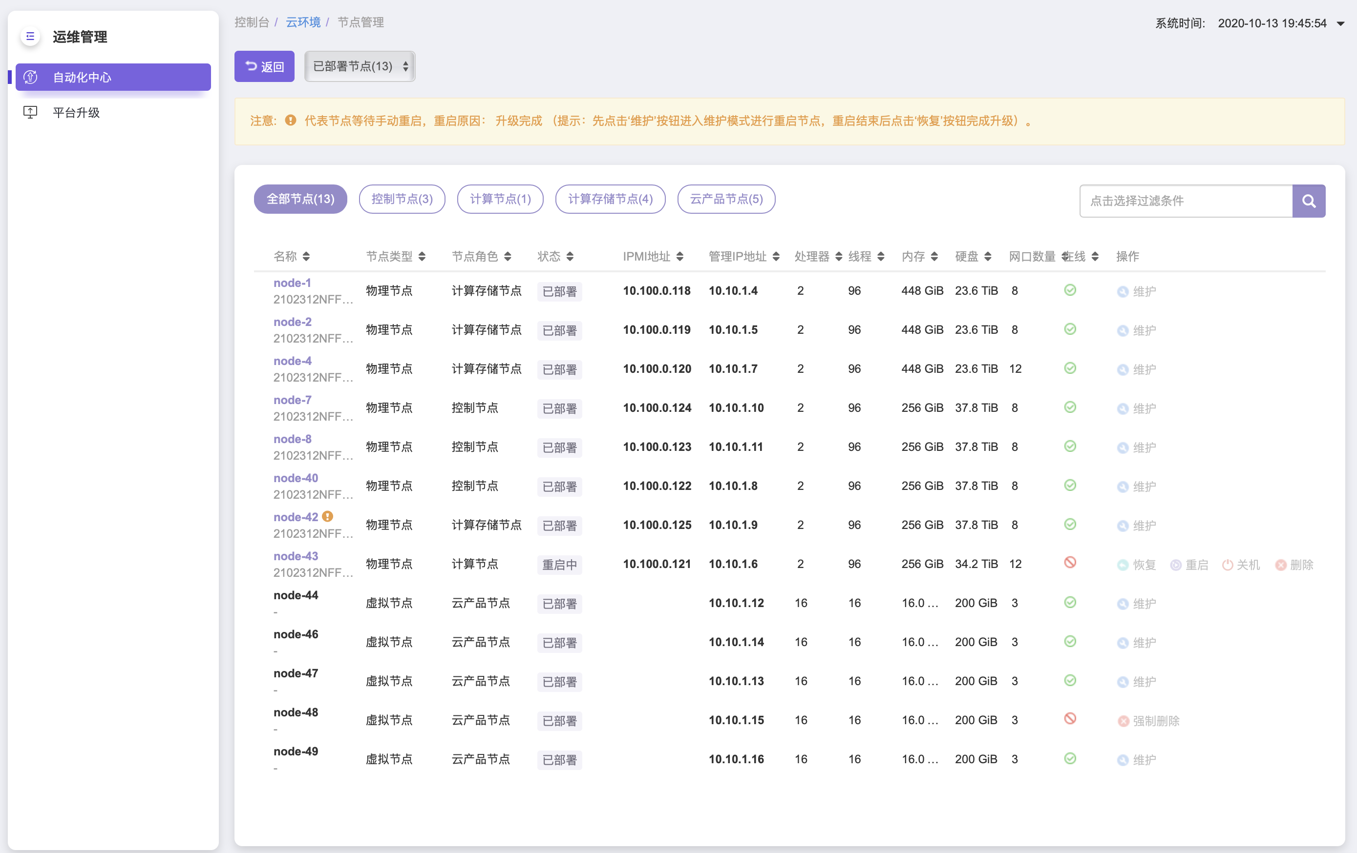 展开详细升级信息,点击“待重启节点/全部节点”链接前往自动化中心,节点名称后有感叹号的节点需要进行手动重启(先点击‘维护’按钮进入维护模式进行重启节点,重启结束后点击‘恢复’按钮完成升级)。